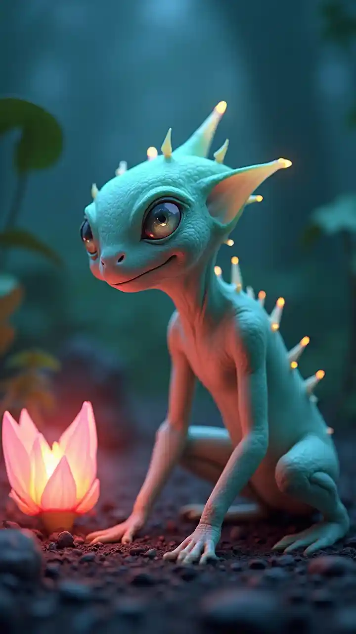 The video begins with a willowy alien sprite crouched low beside a glowing coral-pink flower in a bioluminescent forest. Its glowing eyes are fixed on the bloom, posture tense and elegant, hands close to the soft earth. Its skin glows with muted gradients of mint green, periwinkle, and coral, and irregular glowing spikes line its back and shoulders. As the animation progresses, the creature slowly lifts its head and turns its gaze upward toward the viewer. The movement is graceful and smooth, like a hunter rising into awareness. Its facial expression shifts—from focused curiosity to a mischievous grin. The smirk deepens, one brow lifts higher, and the eyes narrow slightly with playful intent. During this transformation, the creature’s coloring begins to subtly shift—especially along its spikes. Their glow intensifies and the hues change, pulsing with soft color transitions that echo its emotional shift. The camera moves in slightly as the creature lifts its head, drawing closer to its face and shoulders to emphasize the growing expression. The glowing flower remains below, casting a warm upward light, while the cool forest tones stay in the background, dreamlike and hushed. high detail, 8K, UHD, cinematic painterly fantasy lighting, emotional transition, color shift in spikes, slow and fluid head movement, eye contact with viewer