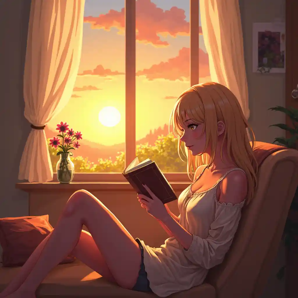 una ragazza sexy di anime che si rilassa su un pullman, che legge un libro, qualche decorazione, al tramonto, quindi l'ambiente dovrebbe essere aranciato, qualche animazione liscia che si ripete come alcuni fiori in un barattolo che si muove con il vento, circa 5 secondi di durata, il video è per amopcany musica di caldo in modo che si ripeta, deve essere molto breve. la finestra è aperta, il vento muove lisce il fiore,