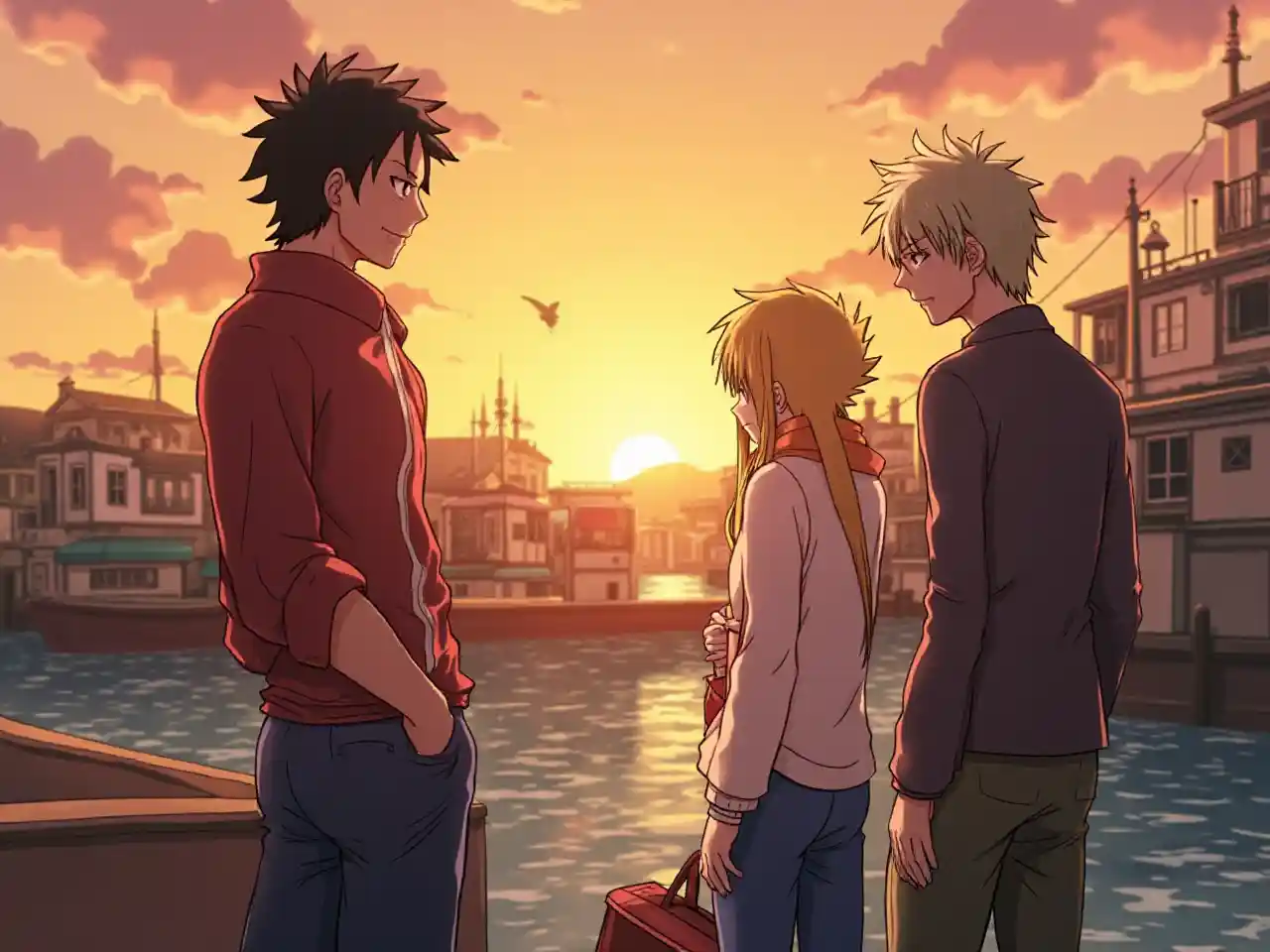 Crossover anime di personaggi di One Piece e Fullmetal Alchemist in piedi in una città portuale al tramonto.