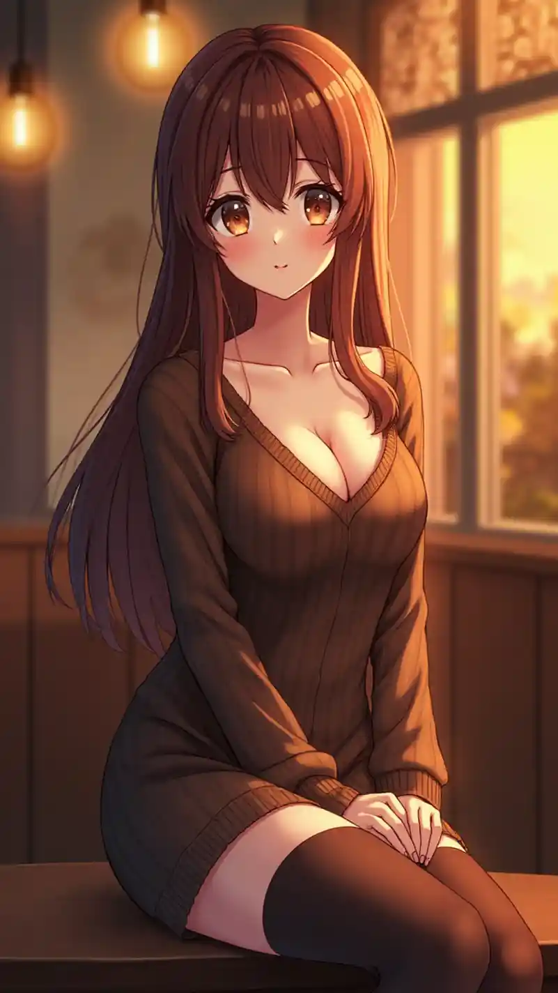 Immagine a grande scala di una ragazza di anime Ultra HD, straordinariamente bella e sensuale, illuminata da una luce di lampada morbida, seduta in un accogliente caffè con un arredamento caldo, con un vestito elegante con un colletto profondo e calzini fino alla coscia, i suoi lunghi capelli che si estendono sulle spalle e un sorriso dolce, grandi occhi lucenti, pelle brillante, calda palette di colori marroni e arancioni, caratteristiche delicate, trucco impeccabile, vibrazioni intime e calde, illuminazione con un bagnato, sottolineando il suo seducente, ben definito petto con un decollato sotti, e lunghe gambe toni con una postura equida, irradiante fascino e calore.