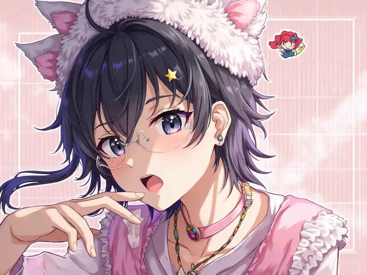 ,(artist:mazjojo:0.65), (artist:pigeon666:0.75), (artist:zawar379:0.83), (artist:remsrar:0.65), (artist:chimmyming:0.72),(artist:yoneyama mai:0.73), masterpiece, 4k, hd, amazing quality, best quality, high resolution, goldenfieldszho, newest, very aesthetic, ultra-detailed, absurdres, perfect lighting, volumetric lighting, (dark lighting), shadowing, (good shadowing), depth of field, lens flare, scenery, amazing aesthetics, cinematic lighting, cinematic, shading, (good shading), counter_shading, ,handsome,interesting, (boy:2.0),male focus, bara,interesting, :},sexy,solo, open mouth, black hair, hair ornament, hat, jewelry, upper body, glasses, choker, tongue, hairclip, medium hair, necklace, star \(symbol\), mole, black eyes, white headwear, ring, x hair ornament, mole under mouth, hairpin, star hair ornament, pink theme, animal hat, pink choker, cat hair ornament, light pink background,grid background,dynamic pose,dynamic angle,Magazine cover,(Fake cover:2.0),(chibi inset:1.2),Schneider,,glasses,