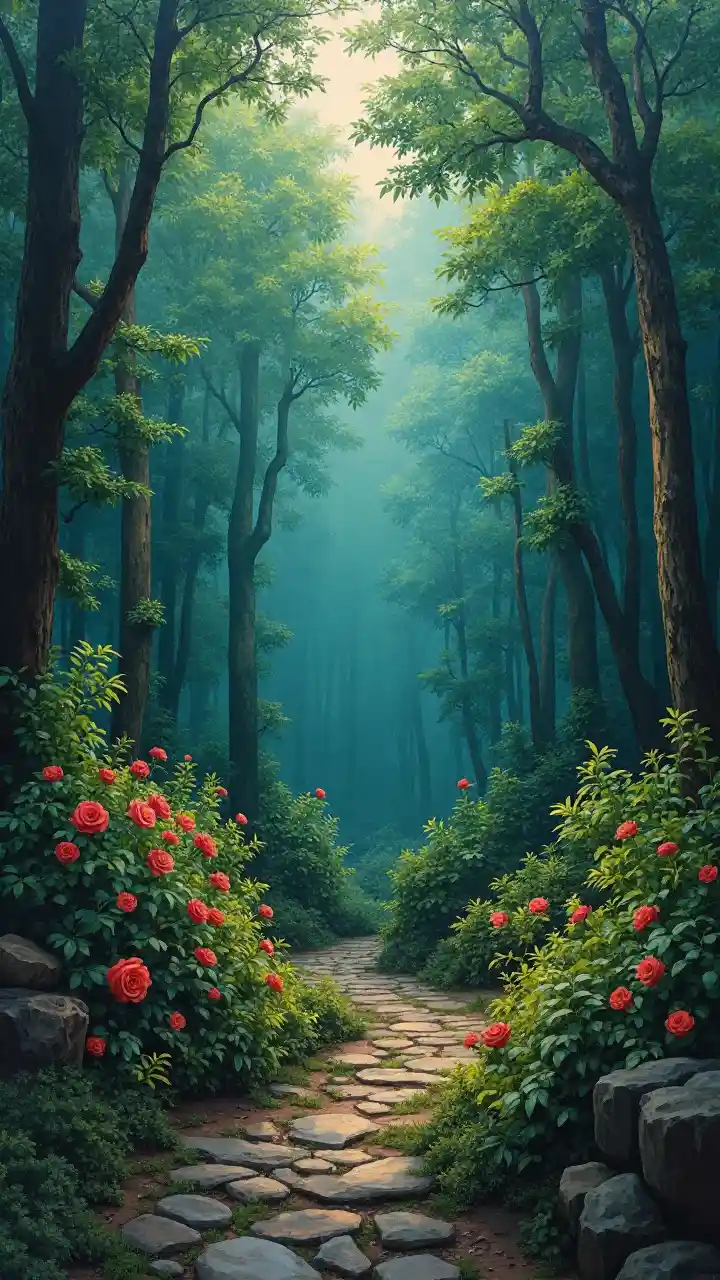prospettiva atmosferica: pittura in gouache fluida: lunghissima immagine di un giardino lussureggiante; ambiente lunatico di "Ray Caesar"; sfondo a motivi di "Bastien Lecouffe-Deharme"; di "Yanjun Cheng", di "Harmonia Rosales"; Acquarello di "joao ruas"; intricato, meticoloso, a colori profondi, crepuscolo di "Bill Brauer"; transi di "Andrea Kowch"