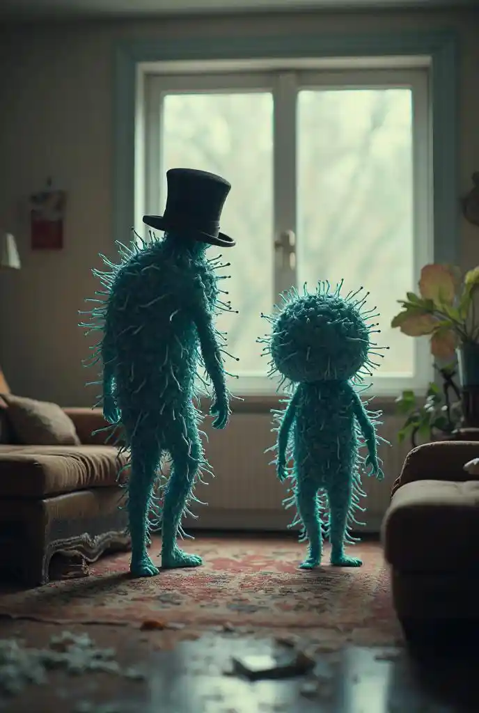una vista microscopica di un mondo di batteri in una casa dove un batterio è mostrato come una figura maschile che va al lavoro indossando un cappello e l'altro spirito