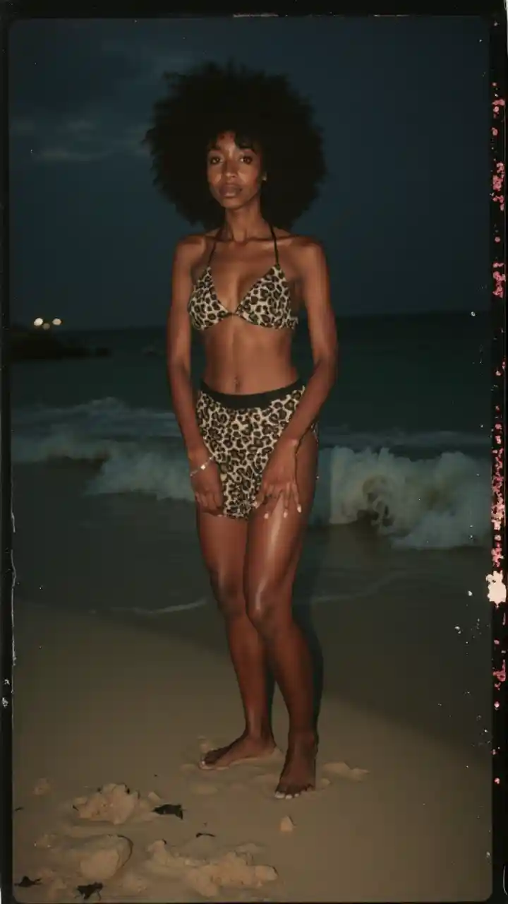OliverFoto di Polaroid, foto notturna, foto di una bella donna di 24 anni, nera, dal fianco in giù, movimento sfocato, piede sulla sabbia, mini gonna sexy, spiaggia