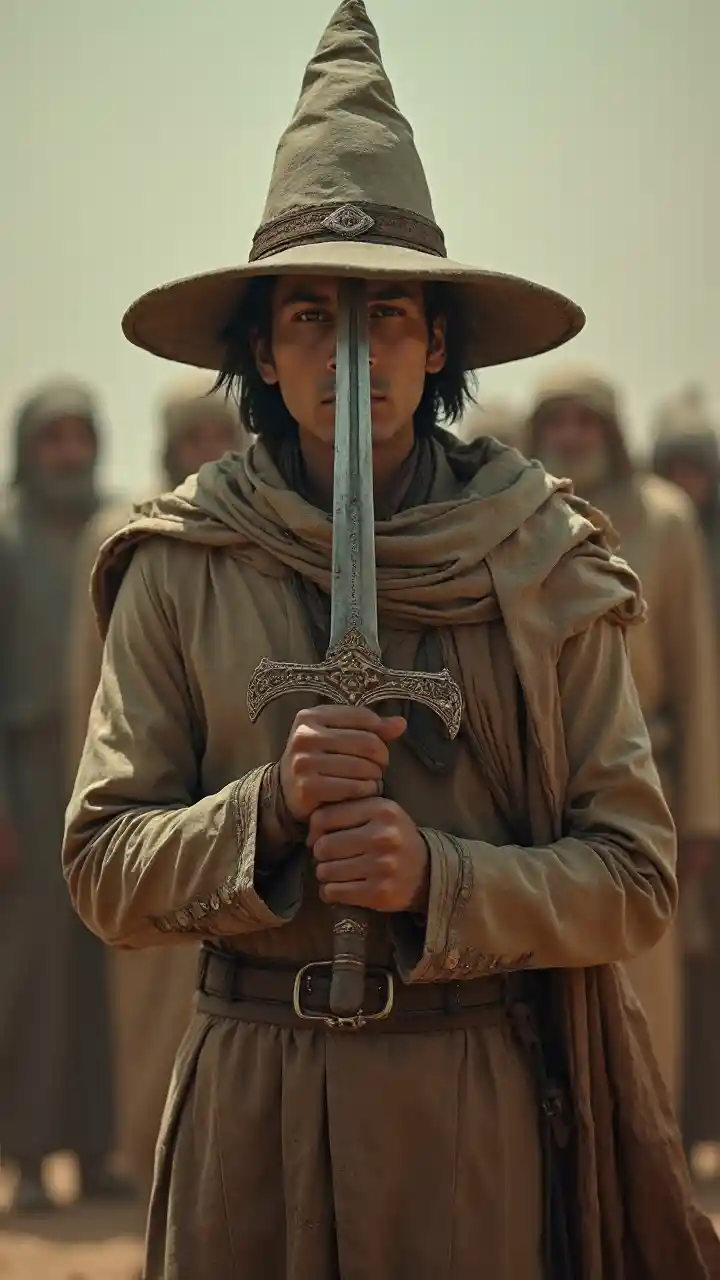Cappello appuntito, pelle traslucida, descrivi la scena accattivante catturata nella fotografia vintage con un artista beduino che ingoia abilmente una spada enorme nello stile di Final Fantasy, in mezzo a un pubblico affascinato. Fornire dettagli sull'abito dell'artista, il design intricato della spada, e le espressioni degli spettatori mentre assistono a questa straordinaria performance., qualità sorprendente, capolavoro, la migliore qualità, iper dettagliato, ultra dettagliato, UHD, anatomia perfetta, ritratto, iper-realismo, maestoso, stimolante, primo piano, un vecchio mantello Fantasy, liscio, Closeup, by Dring, peel, atmosferica, composizione cinematografica, ombre morbide, stile geografico nazionale