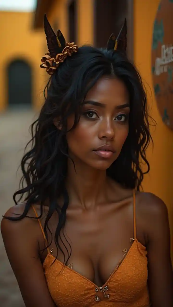 DavidUna bella ragazza nera dai capelli lisci, compresi, bei e spessi. Usa una trance e un bel top amarelo in un ambiente messicano foto iper realistica e dettagliata