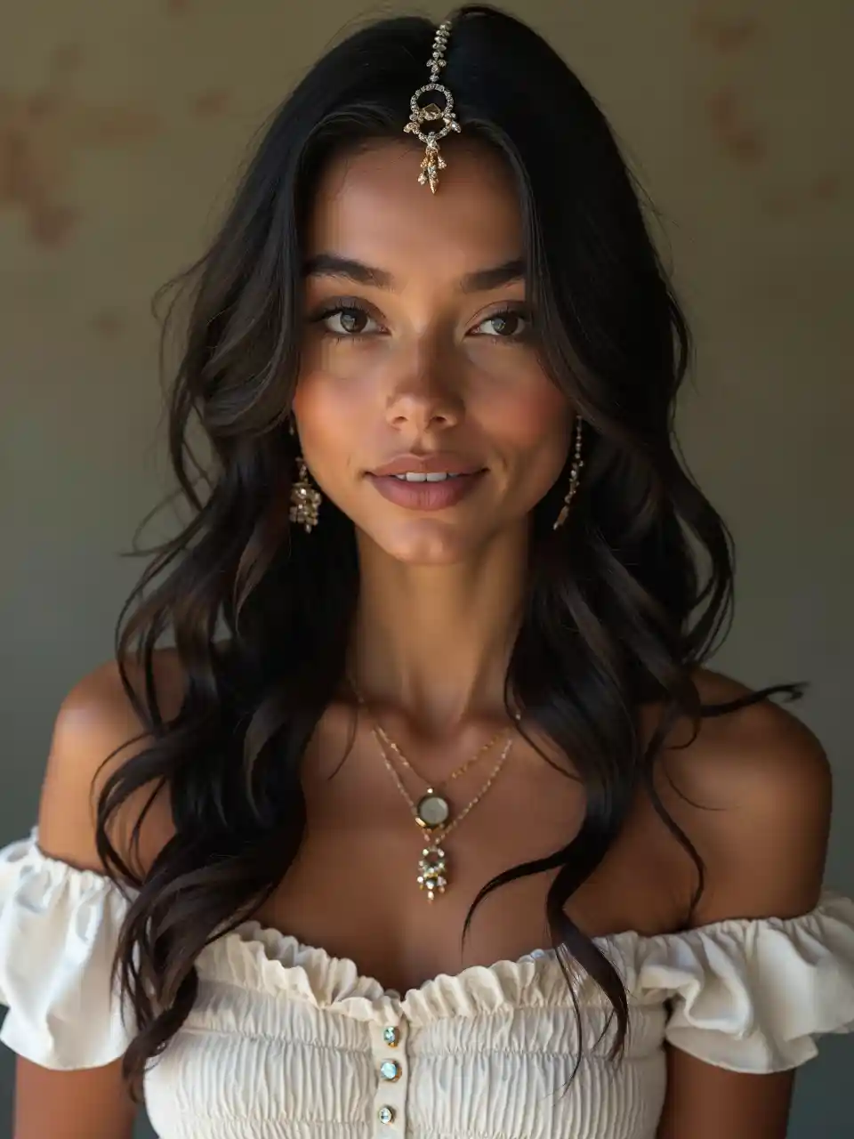 Una giovane nera con capelli lunghi e lisci in un ambiente messicano usa una camicetta bianca guarda una macchina fotografica e usa una tiara senza capelli foto iper realista