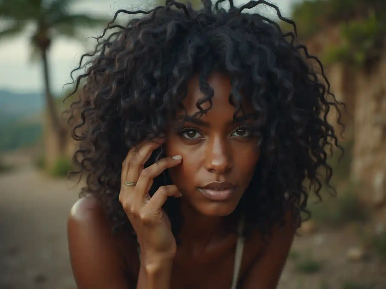 Una donna nera che fissa la macchina fotografica con i capelli ricci