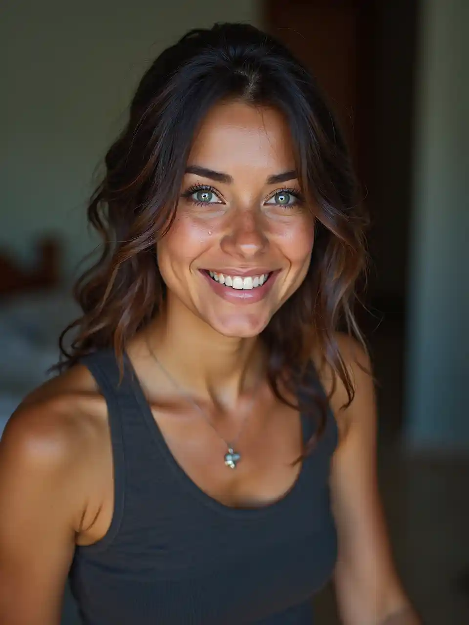 Una donna brasiliana, con gli occhi azzurri e grigi, non molto chiari, con un bel sorriso. Una donna indossa una maglietta bianca e non guarda direttamente la telecamera. Un'immagine mostra una donna con la cintura in alto.