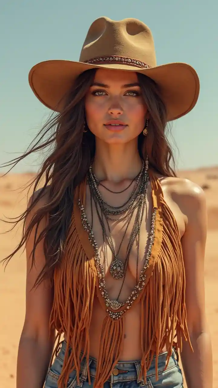Un cappello di ispirazione bohémien, con una candela frangia, con collane a strati, disegnato in stile indie, tagliente e seducente. sfondo desertico. alta qualità, foto realistiche, risoluzione 4k