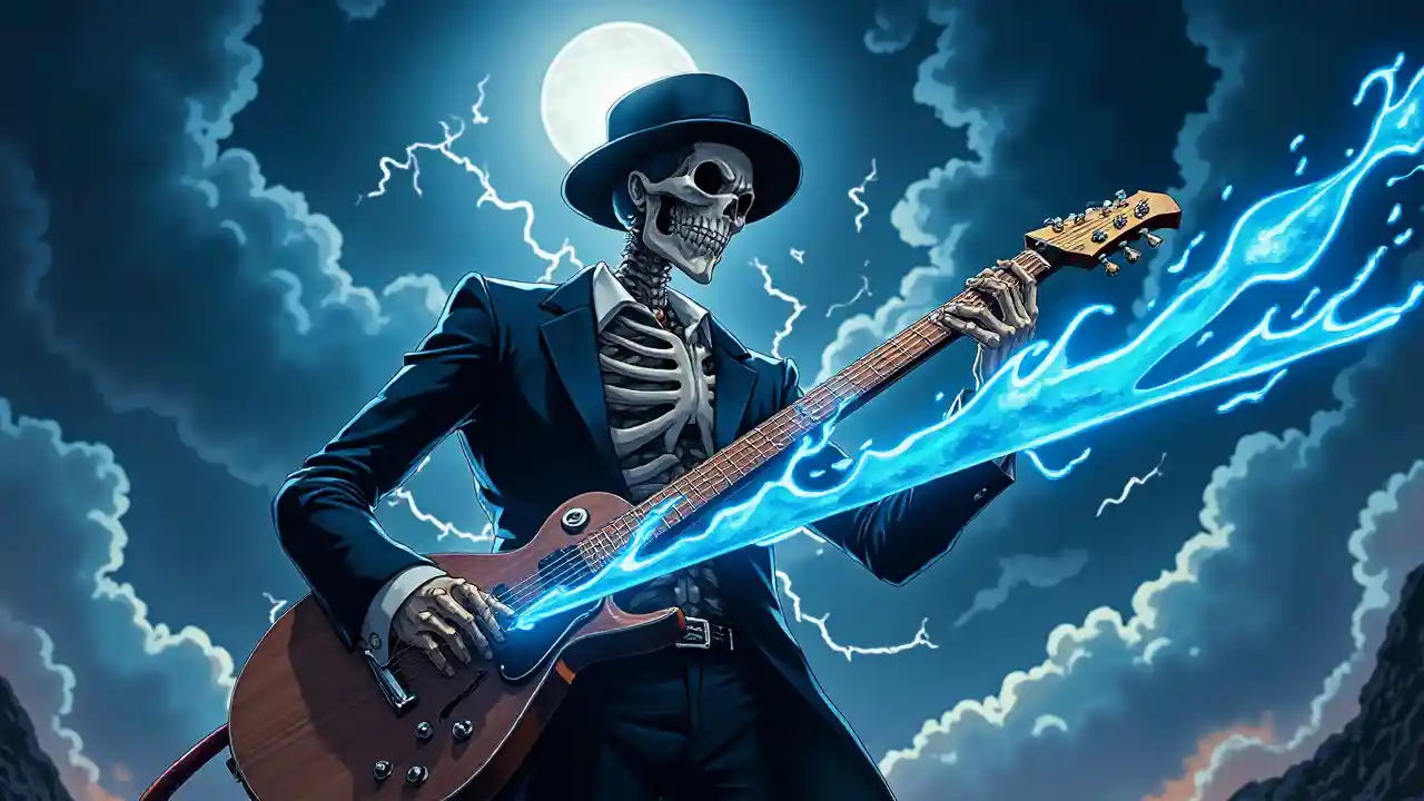 Ritratto in stile anime di Brook dei One Piece, il alto musicista con lo scheletro, con il suo classico completo nero e cappello, che suona la chitarra con forza, mentre scatena il suo caratteristico attacco con la energia blu che emana dalla lama. Le sue ossa brillano sotto un riflettore drammatico, e dietro di lui c'è un cielo buio e tempestoso con fulmini che colpiscono, mescolati con note musicali vibranti che vorticano intorno a lui. La scena è piena di movimento dinamico, colori intensi e illuminazione cinematografica in formato verticale 9:16.