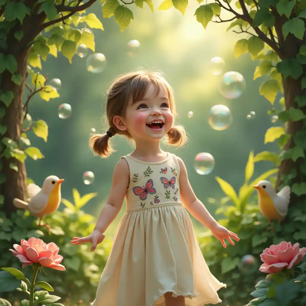 In cerca di bolle in un giardino da fiaba, una bambina bianca di 5 anni con le indossa un vestito ricamato di farfalla. Vigne luminose e passeri che cantano la inquadrano, i suoi risati irresistibili irradiano innocenza e fascino magico in una scena naturale incantata.