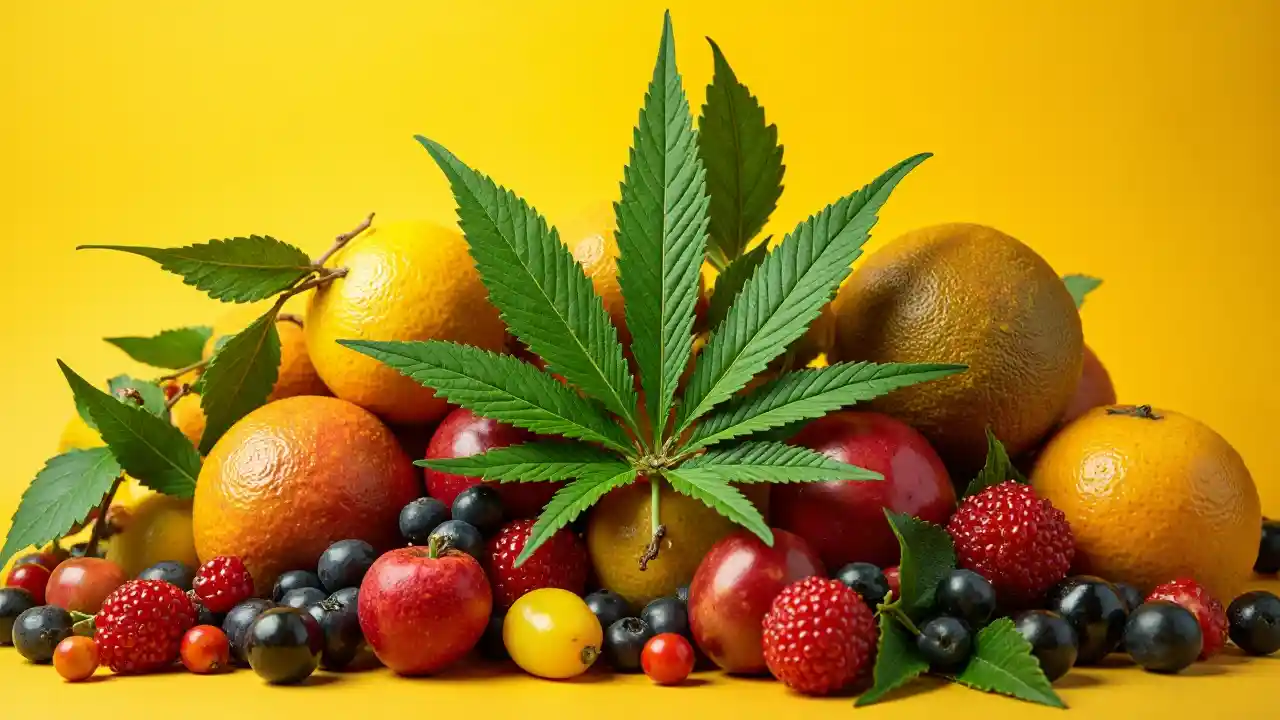 Una foglia di cannabis a 7 punte circondata da vari frutti e bacche, sfondo giallo, colori vivaci e saturi, elegante, altamente dettagliato, di fuoco, illuminazione drammatica, incredibilmente dettagliato