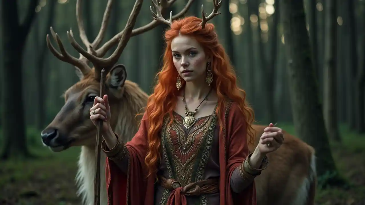 donna di capelli rossi pagana celtica con corna in testa, dea regale, bella, in una foresta, indossa antiche vesti di dea con ricamo celtico, sfondo sera scura, in piedi accanto a una orgogliosa renna e tenendo un bastone in una mano