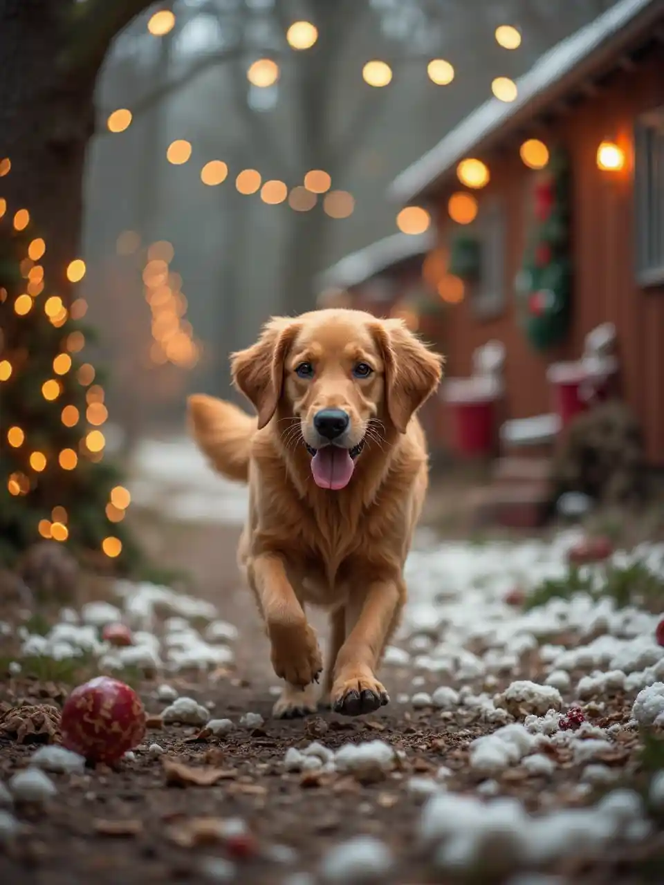 HarperUn Golden Retriever di Natale che corre nella scrofa con la famiglia. Il cortile dovrebbe essere pieno di decorazioni e luci di Natale