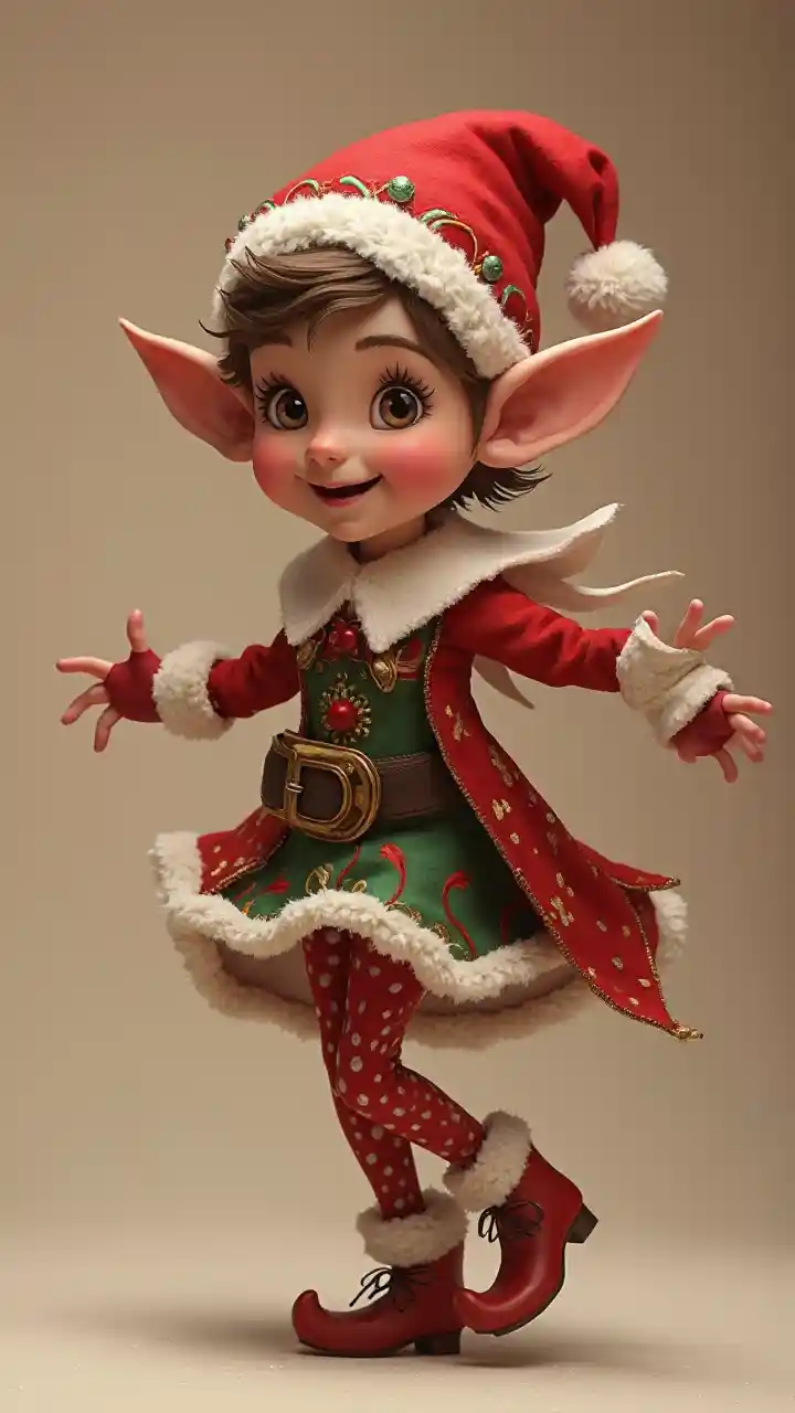 Per favore, create un'immagine foto-realistica di un elfo di Natale, ornato in abiti festivi, sorridendo e ballando con gioia. Il costume dell'elfo dovrebbe essere vibrante e dettagliate, catturando l'essenza dello spirito natalizio. L'espressione sul volto dell'elfo dovrebbe irradiare felicità e allegria, con gli occhi scintillanti di allegria. La posa dell'elfo dovrebbe trasmettere movimento e gioia di danza. Lo sfondo dell'immagine deve essere di un colore solido e neutro, garantendo che l'elfo rimanga al centro e facilitando la facile integrazione in altri disegni
