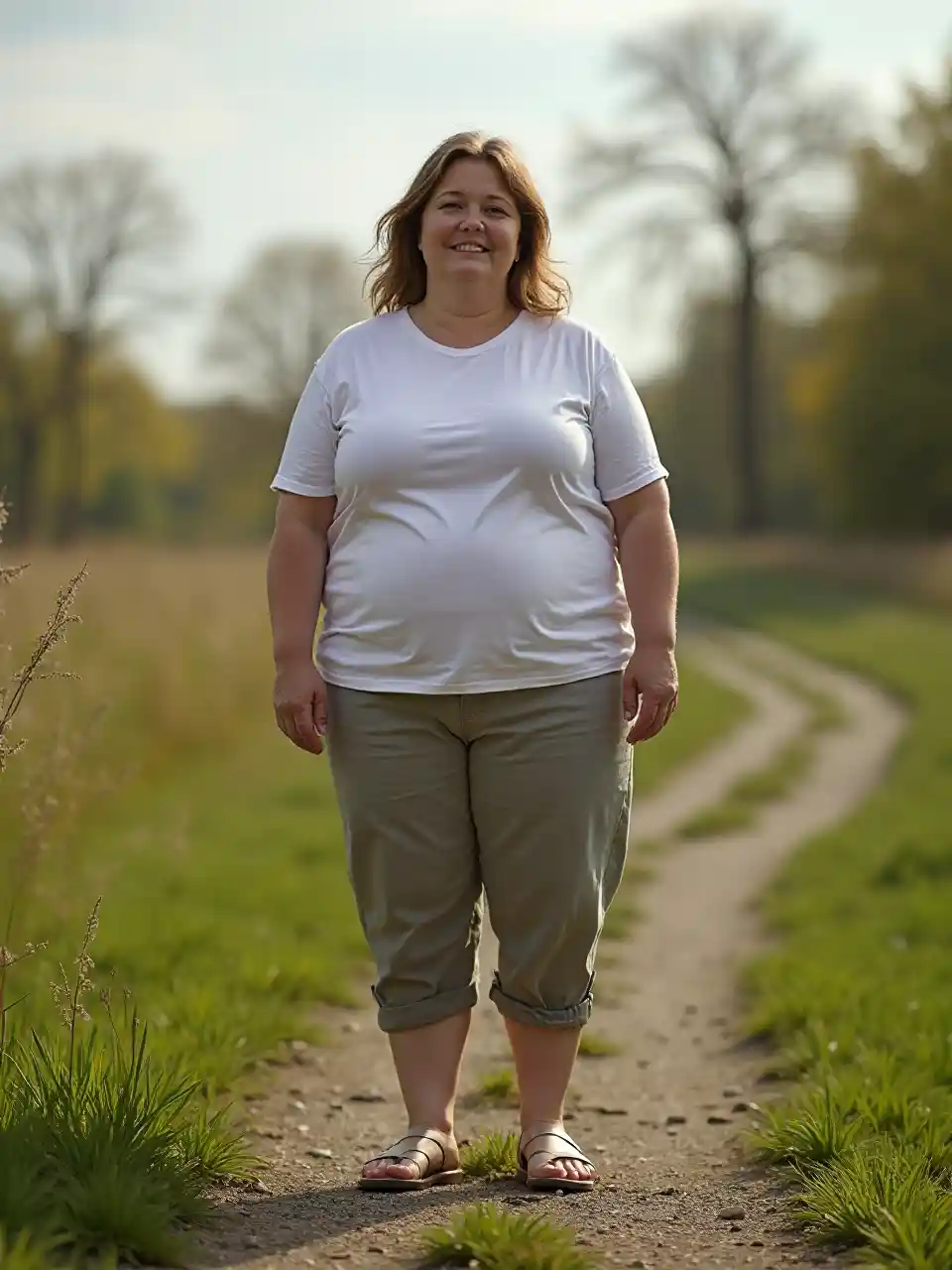 DavidFoto a figura completa, sovrappeso e molto ciccione, XXL, 40 anni, donna grassa bianca europea, in abiti a due, in piedi in sandali piatti, su un sentieri