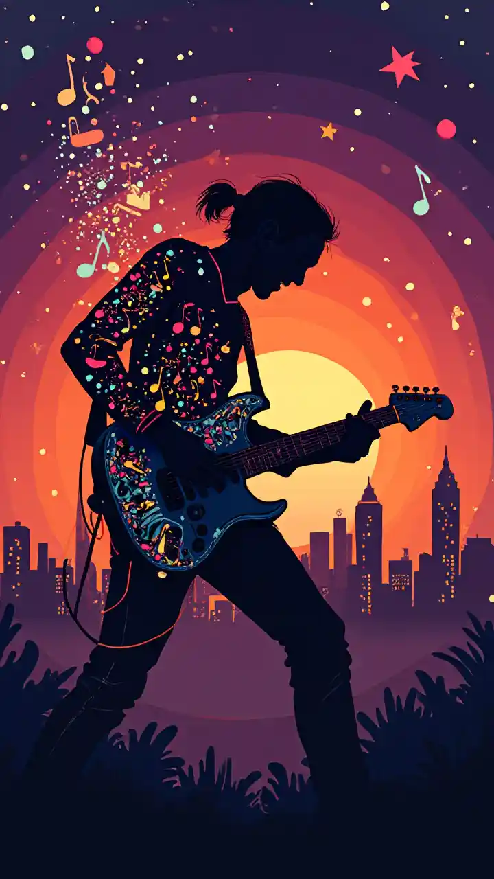 Create una silhouette di un musicista che suona appassionatamente una chitarra elettrica, sullo sfondo della città al tram. La silhouette del musicista è ricca di un colorato disegno di onde sonore che irradiano verso l'esterno, simboleggiando l'energia contagiosa della musica. Il cielo passa da viola profonda ad arancione, macchiato di stelle stilizzate e di note musicali. Usate una palette di colori che contrasta le sagome scure con sfumature vivaci, catturando l'essenza esaltante di una scena musicale viva.