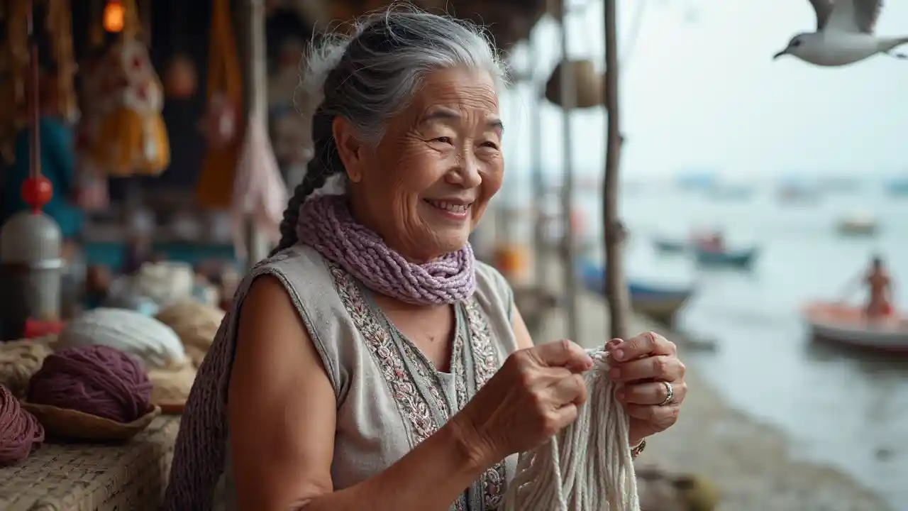 Una donna asiatica di 82 anni con trecce d'argento indossa un vestito ricamato con le. Stalle e gabbiani tessuti la incorniciano, i suoi aguzzi irradiano abilità e orgoglio al mare in una scena vibrante e culturale. Il suo sorriso parla del mare.