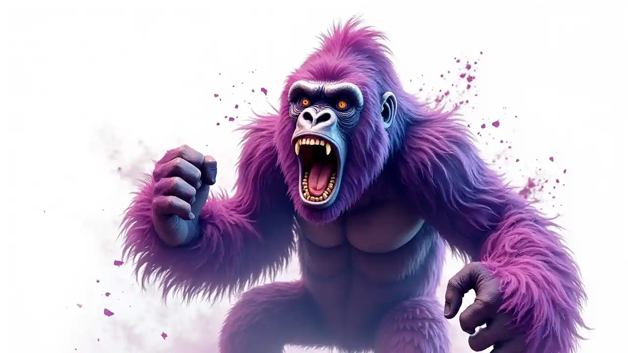 Un'ampia foto di un gorilla viola con molti altri colori che urlano su sfondo bianco