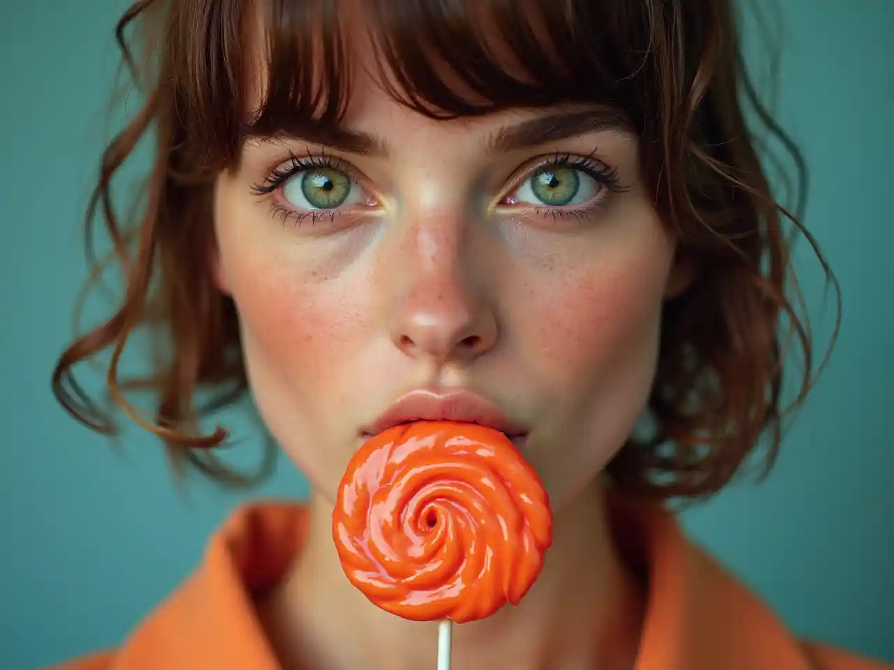 Fotografia di una ragazza con una lecca nelle labbra, primo piano del viso, ragazza di bellezza nello stile di Mary Quant, colori saturi, Contrasto, foto in studio, foto professionale, colori ricchi, immagine dettagliata, volto dettagliato