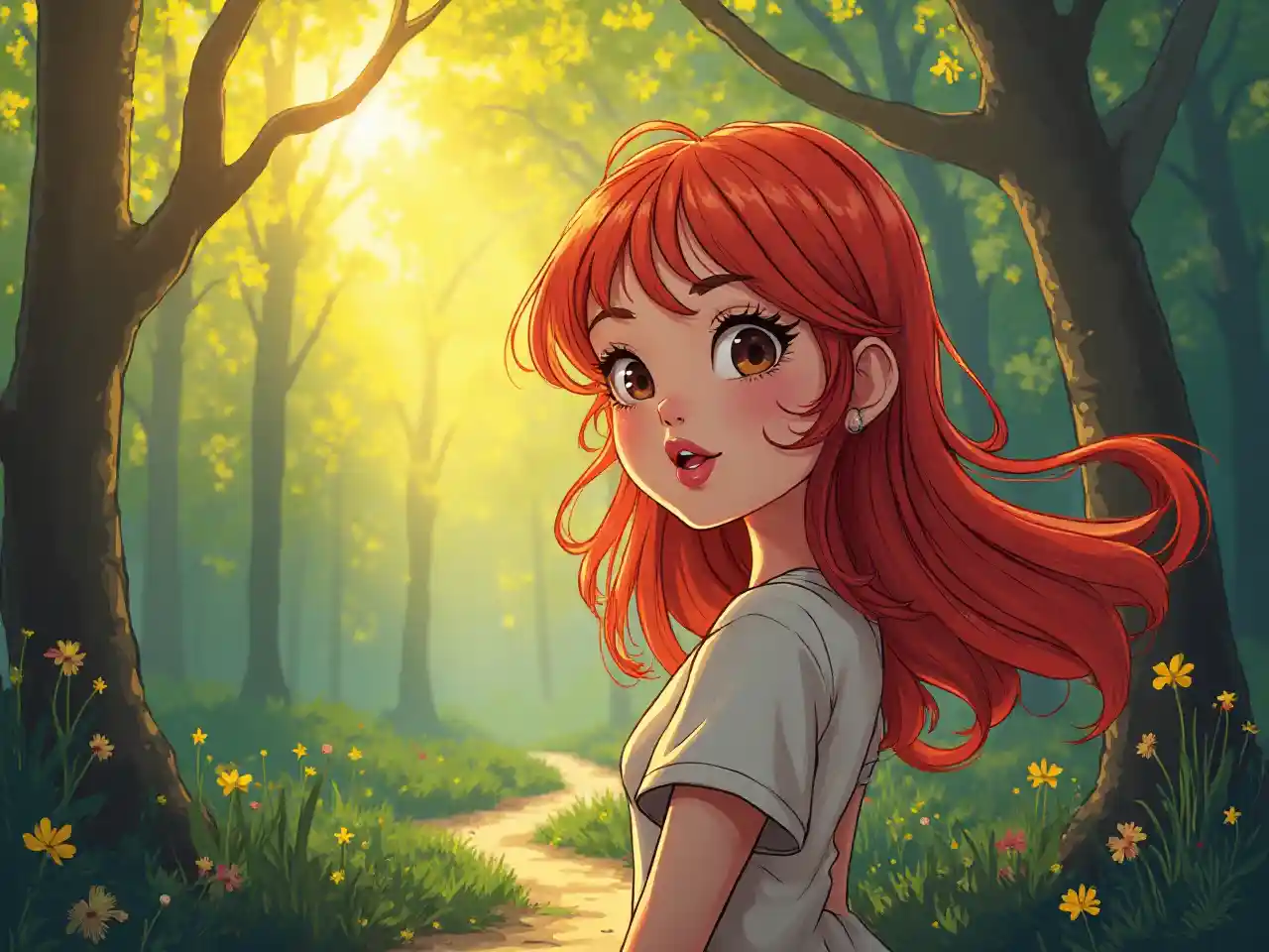 Ragazza dai capelli rossi, bella, con dettagli, 4K, fondo forestale, fumetti, stile vettoriale