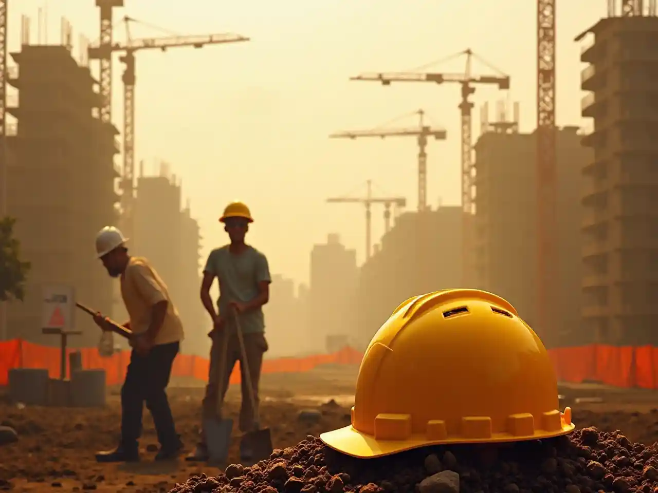 Against a backdrop of construction activity, a vibrant yellow hard hat sits prominently in the foreground, symbolizing safety and diligence on a work site. Behind it, two silhouetted figures labor together, one wielding a shovel while the other appears to be communicating, both focused on their task amidst the dusty environment. Towering cranes loom in the distance, busy lifting materials to various building structures that rise from the ground, while construction barriers and a caution sign, reading "Precaución," emphasize the need for safety in this bustling scene. The warm, muted color palette and hazy atmosphere create a sense of hard work and the ongoing transformation occurring in this urban landscape, encapsulating the essence of a dynamic construction site.