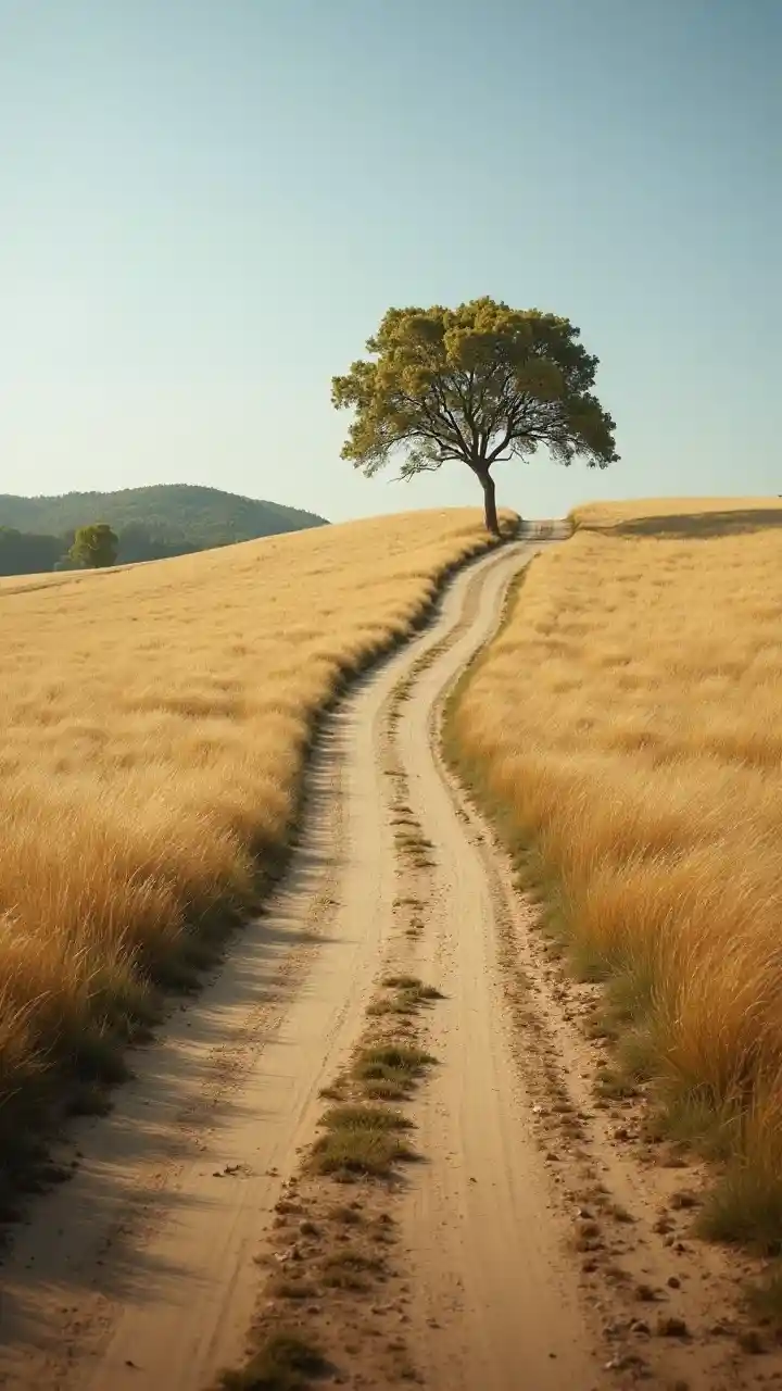 Una stretta strada di terra che si snoda attraverso una tranquilla campagna, fian di campi d'oro e un albero solitario che sta sentinella. La semplicità della scena irradia nostalgia e riflessione tranquilla.