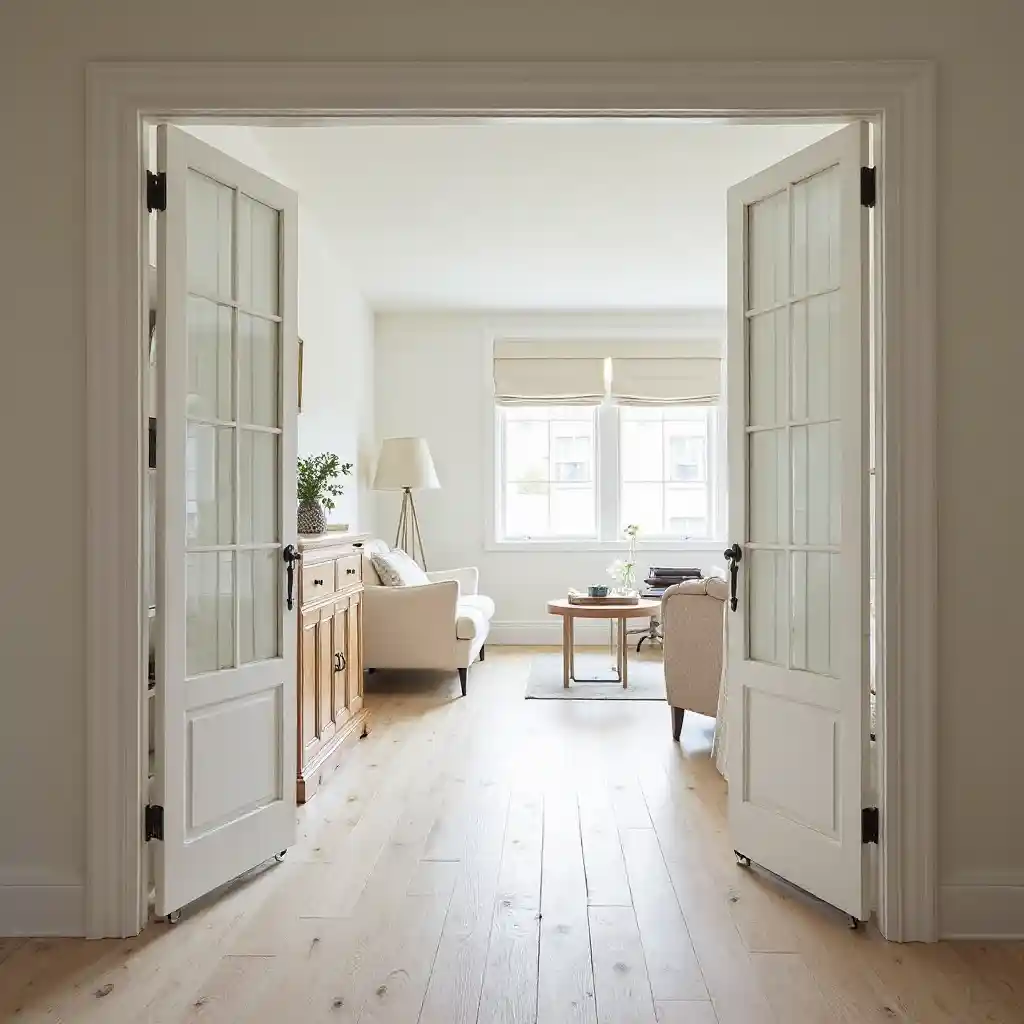 Bagnato da una leggera luce naturale, l'interno spazioso presenta una miscela di elementi moderni e accoglienti con i pavimenti di legno pallido e le pareti di legno. Due serie di eleganti porte francesi sono incorniciate su entrambi i lati, invitando al calore e all'apertura, mentre un sorprendente armadio di legno si erge in primo piano, aggiungendo un tocco di fascino rustico. Sullo sfondo, si vede un salotto ben illuminato e si possono vedere comodi posti, creando un'atmosfera accogliente. La palette di colori neutri è ulteriormente accentuata da una lampada da terra vicina e da trattamenti per le finestre che ammorbidiscono la luce, evocando tranquillità e un senso di casa. Nel complesso, questa scena riassume un ambiente di vita sereno e elegante.