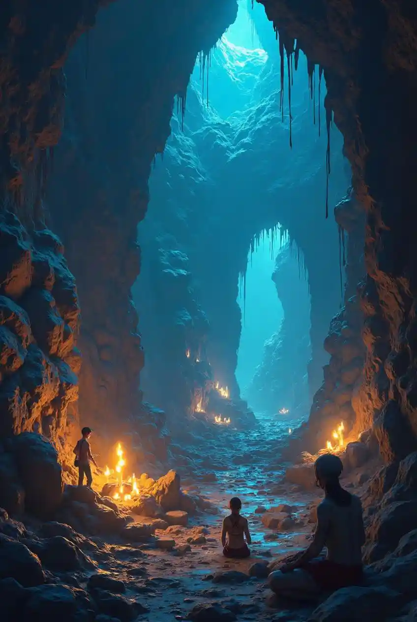 Cavern city glowing with crystals, inhabitants with glowing tattoos, channeling dark fantasy anime visuals.