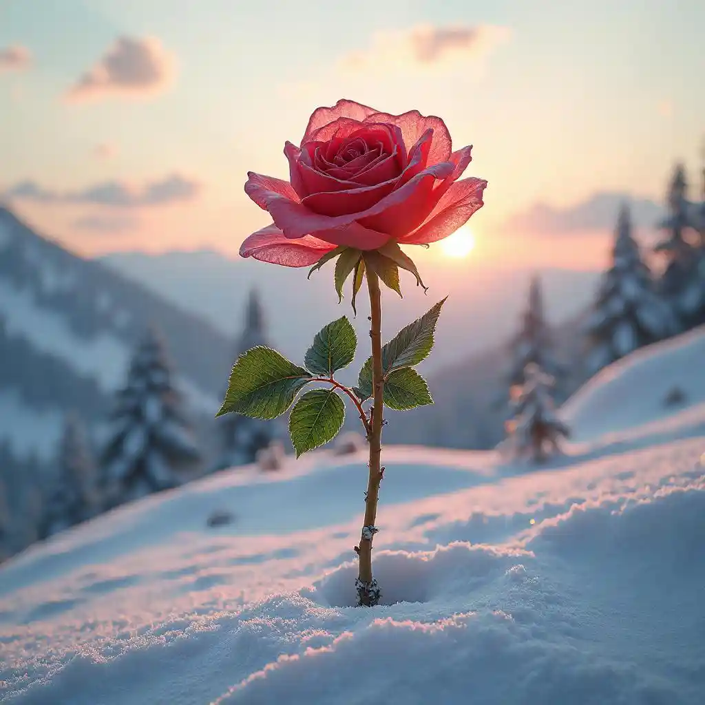 OwenUna rosa in piedi fatta di vetro in una montagna di neve con un sole la rosa è luminosa come il cristallo