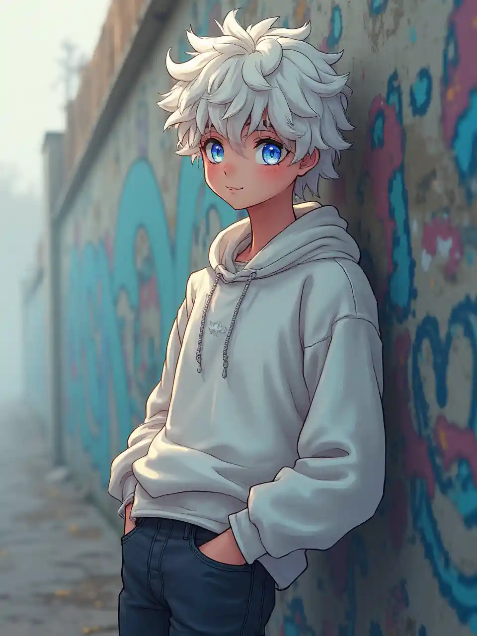 Solo, ragazzo, con un focus maschile, una faccia carina. ( capelli bianchi ricci, occhi scintillanti con punti di risalto iridissanti, abiti con un maglione elegante e pantaloni magri, si trova vicino a un muro con graffiti, ore del mattino, leggera nebbia intorno. )),colore piatto,colore piatto,molto estetico,capolavoro,faccia perfetta,faccia dettagliata,faccia molto dettagliata,occhi perfetti,occhi dettagliati,posa dinamica,angolo dinamico,sfondo dettagliato,sfondo bellissimo,altamente dettagliato,qualità,mani perfette,5_ dita,Perfetta Mano Detagliata