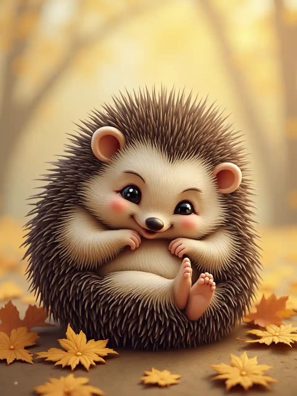 Un affascinante ed adorabile ricurvo in una cucciola accogliente, le sue piume spinose che si distinguono sullo sfondo delle foglie cadute. L'espressione carina e la forma compatta del riccio suscitano un senso di calore e di conforto.