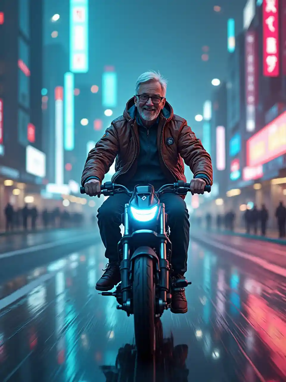 In una città virtuale, un uomo europeo di 81 anni con gli occhiali indossa una giacca con i circuiti a LED. Grattacieli al neon e droni lo inquadrano, le sue rapide curve irradiano un'energia futuristica in una scena vibrante. Il suo sorriso riflette uno spirito giovanile.