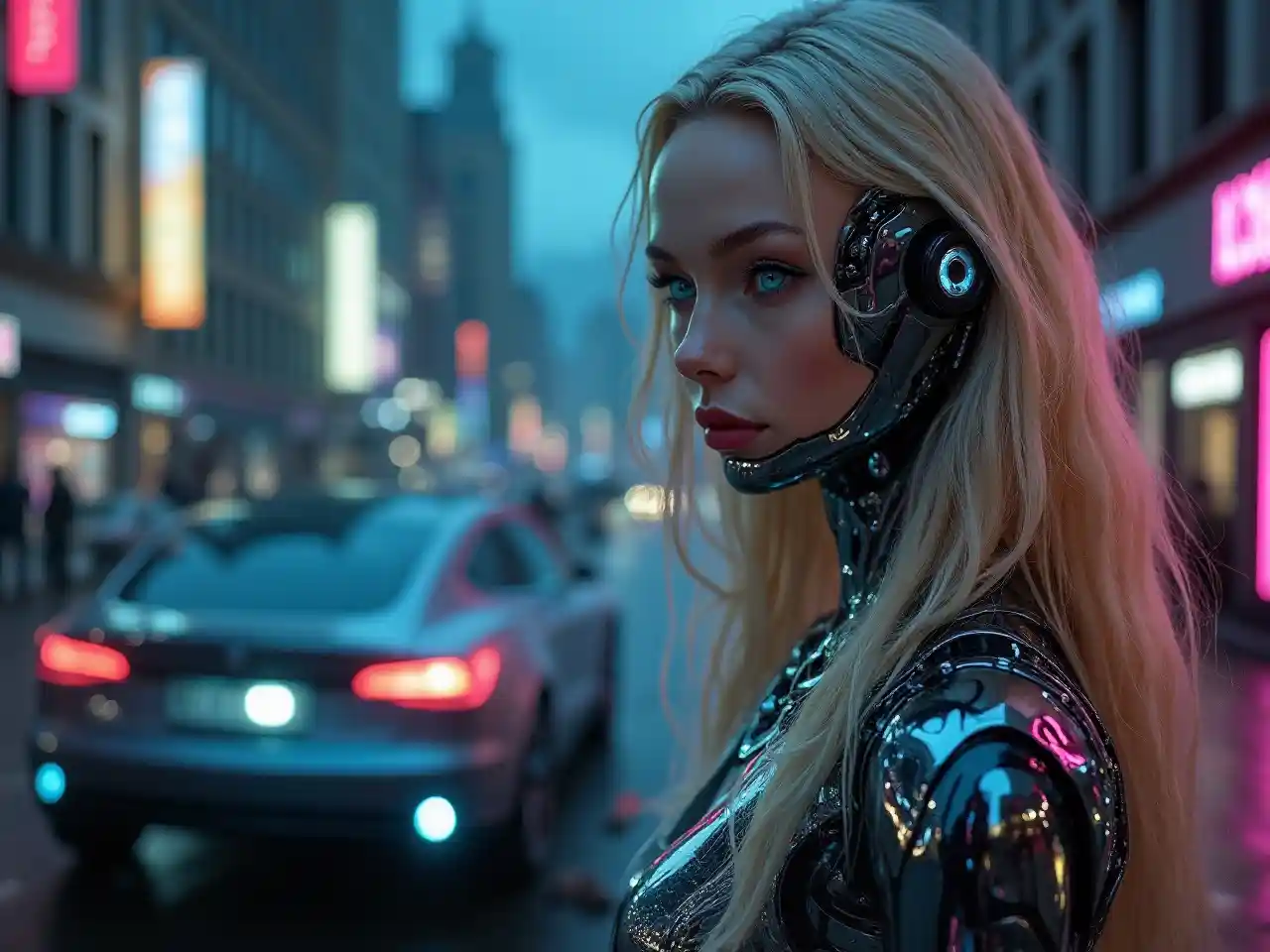 Robot biondo femminile in stile M3GAN con occhi blu e labbra rosse accanto a un'auto Tesla scuro, futuristico, di alta qualità, cyberpunk, stile Hamilton