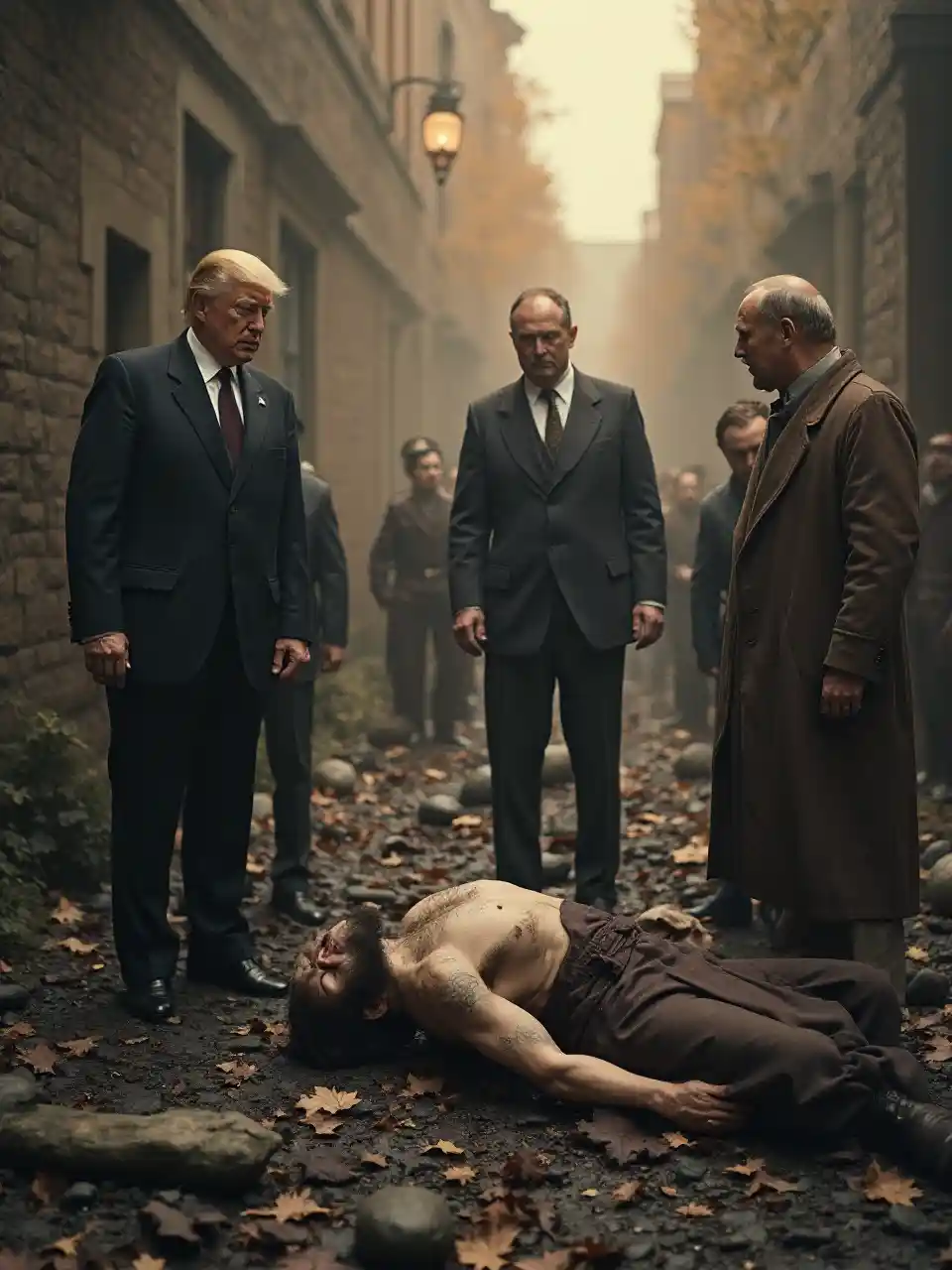 Trump, Hitler e Putin sono alleati e stanno calpestando il popolo giugaro con i loro eserciti. Vediamo il diavolo nell'angolo e Gesù è morto nell'altro angolo
