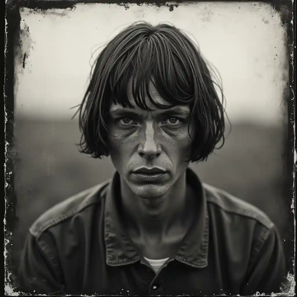 MichaelUna foto di un uomo cieco, un contadino spaventoso, con i capelli scuri, emozioni neutre sul viso