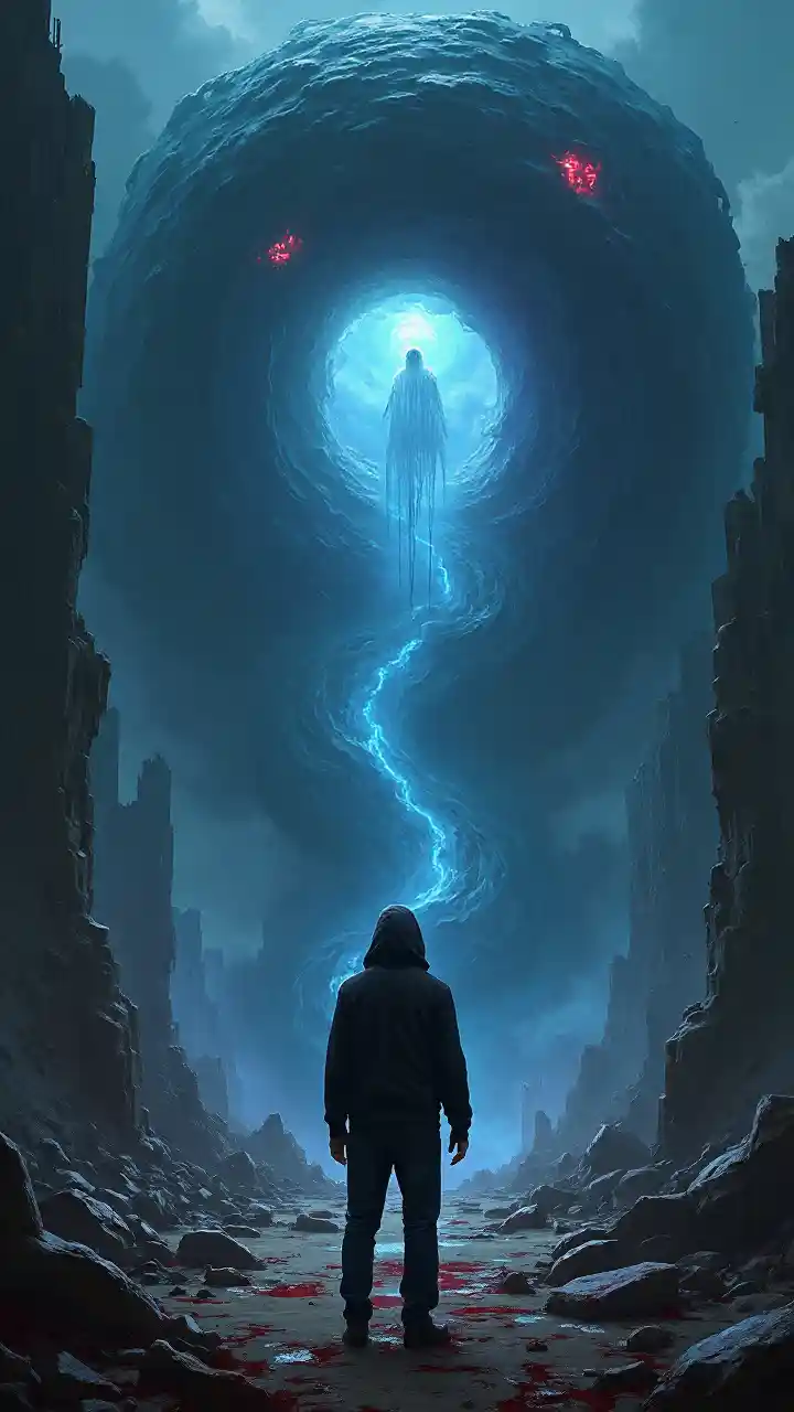 Un quadro digitale scuro e surreale in uno stile di horror e fantasia. Sullo sfondo domina un portale torreggiante, che emana inquietanti tonalità di luce blu e viola. Dalle profondità del portale emergono terrificanti mostri: vampiri con la bocca insanguinata, un lupo insidiante, una volpe di nove code, spettri di scheletri, e altri orrori indicibili. Il paesaggio circostante è una rovina torta e in decomposizione, cosparsa di frammenti e di macchie di sangue. In primo piano, un solo sopravvissuto sta con le spalle verso lo spettatore, indossa una felpa nera con il cappuccio alzato, il corpo teso, preparato come una sentinella. L'illuminazione è inquietante, sottolineando il luccichio del portale e gettando la silhouette del sopravvissuto in forte rilievo. Alto dettaglio, texture fotorealistiche, atmosfera cinematografica, illuminazione dinamica, 400 pixel.