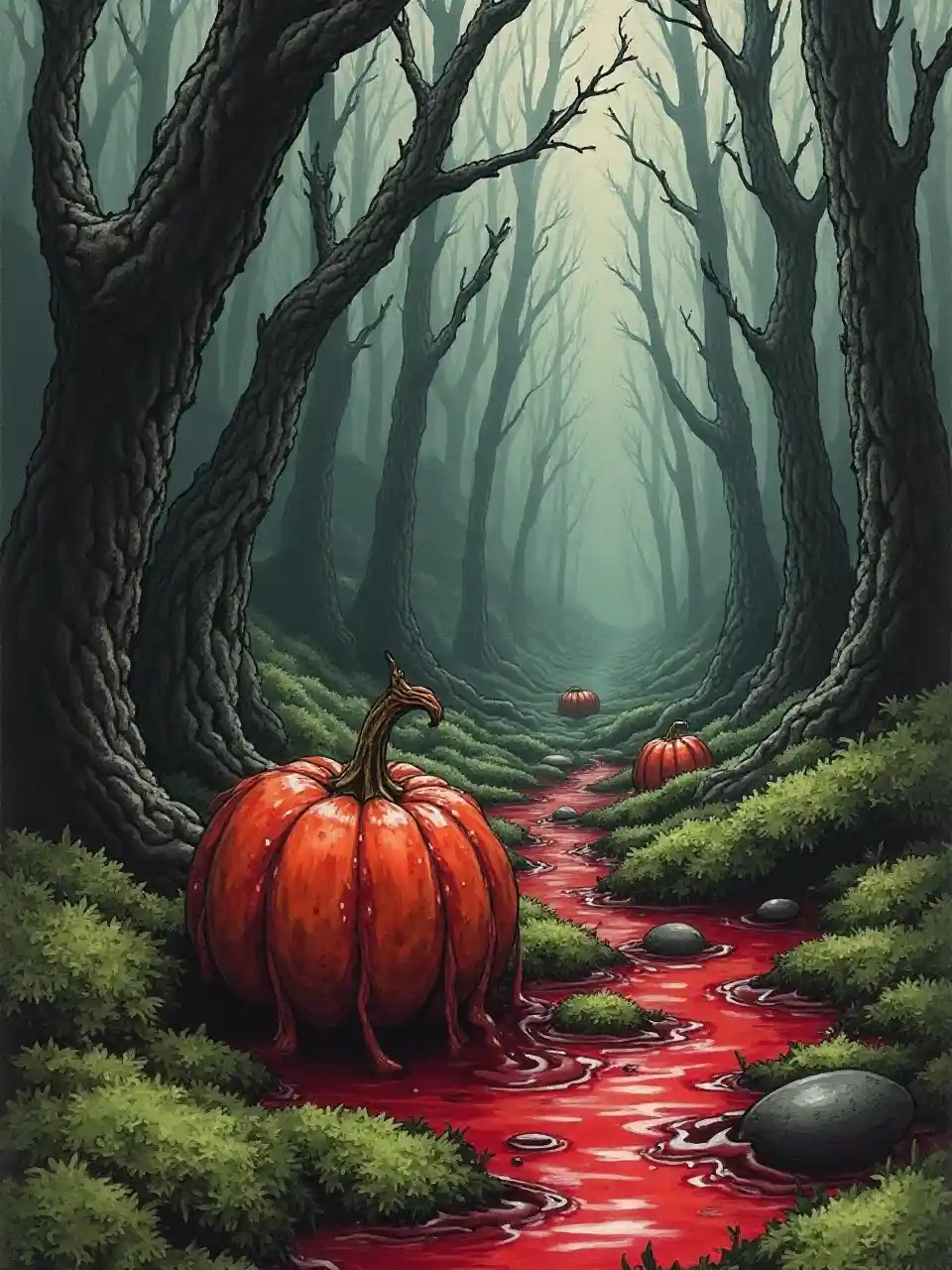 (toscale, semi di zucca)), sparse e parzialmente rivestite di fluido rosso scuro e di polpa intricata, poggiate su un pavimento boschivo con la nebbia. Gli alberi circostanti sono contorti e nudi, sbiadendo in un fondo cupo e ombroso. :: illustrazione horror fantasy dark :: stile di disegno in inchiostro e grafite :: ((look disegnato a mano)) di Gerald Brom, Ian Miller, Zdzisław Beksiński :: ((texture gritty))) :: ((atmosfera di un certo modo)) :: inquietante, antico, innaturale