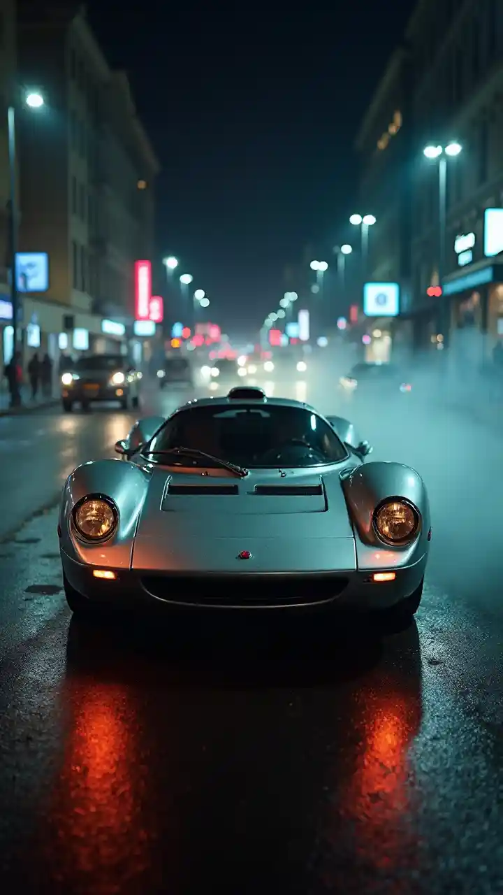 foto analogico cupa di una Lancia Stratos Zero argento, vista bassa, vista a livello del terreno, vista diagnostica, alluminio spazzolato, guida su una strada trafficata di notte, foto scura, luci, atmosfera affumicata
