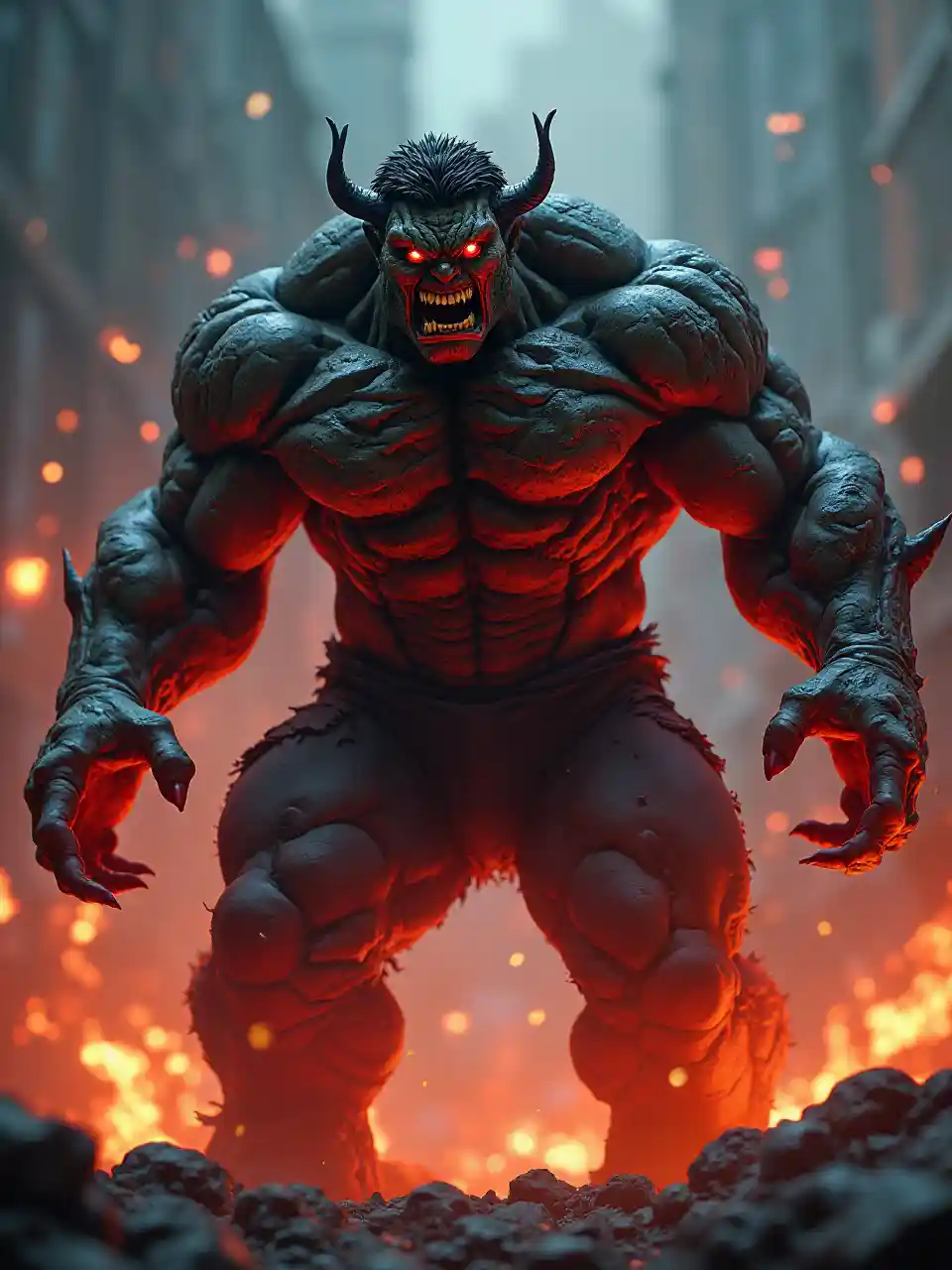 "Un terrificante Hulk con una pelle scura, quasi nera, con vene rosse, i suoi muscoli gonfi di poteri soprannaturali. Delle corna demoniache sporgono dalla fronte, e i suoi occhi rossi brillanti di energia caotica. I suoi mostruosi artigli spaccano l'aria mentre fiamme e fumo si alzano intorno a lui. Il suo corpo emana un'aura infernale e le crepe fuse si diffondono sul petto come vene di lava. Il terreno sotto di lui e' bruciato, brilla con un calore infernale. Urla nella notte, la sua voce scuote la terra. "Iper-realistico, cinematografico, ultra dettagliato, qualità 32K".