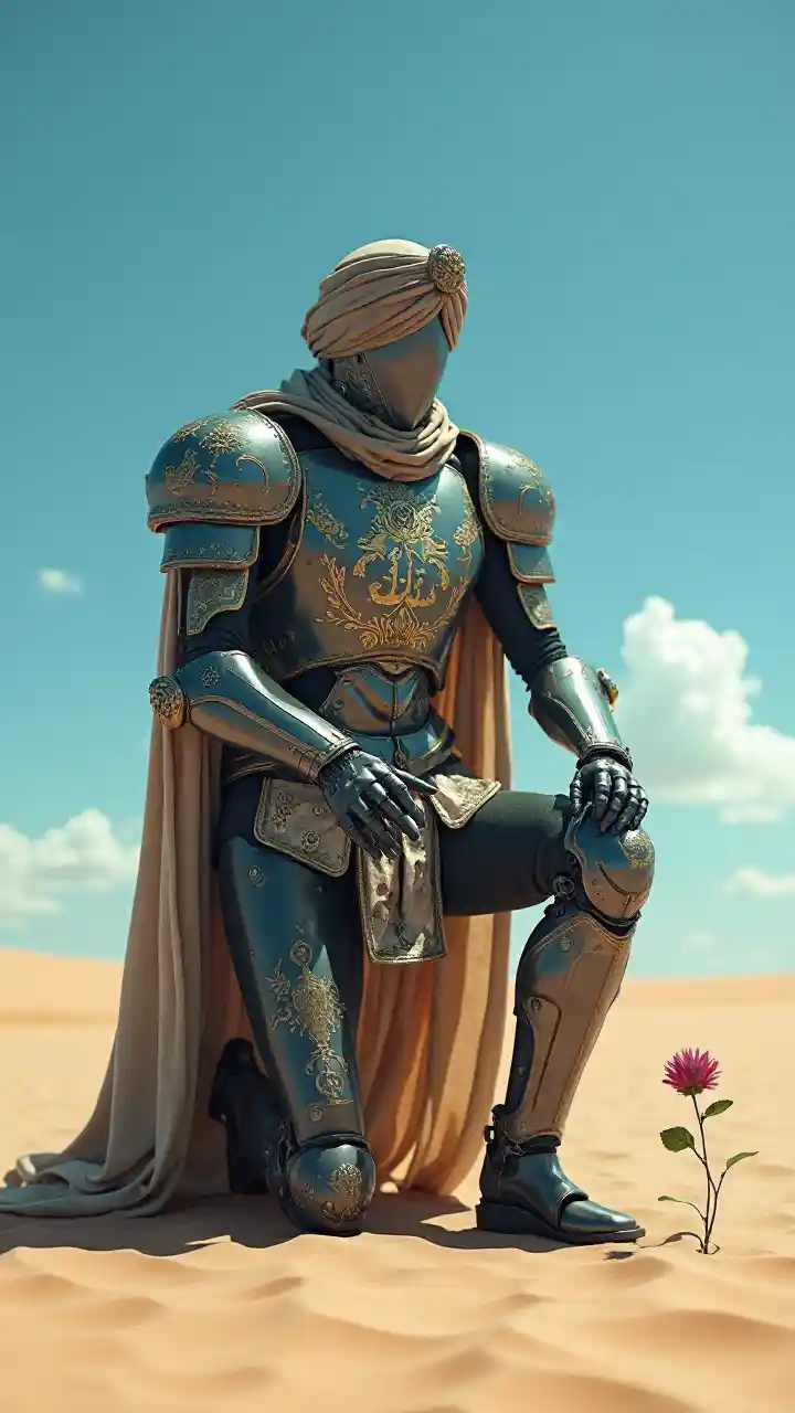 In a desolate desert under the vast expanse of blue sky, a majestic Sikh king kneels, adorned in a striking blend of 1800s regality and neo-futuristic technology. His turban stands proudly under the sun, while a Japanese mecha exoskeleton, reminiscent of Gundam suits, encases his form. Crafted from cutting-edge carbon fiber, the exoskeleton is intricately engraved with gold Punjabi script that imbues the suit with an aura of magical power. A long, heavy cape flows behind him, invoking a sense of grandeur and history. His face is masked with a gleaming metal cover, exuding a mysterious allure. In the center of this imagery, the king reaches down gently to pick a solitary flower, a symbol of peace in the endless stretch of sand around him. This scene captures a serene and romantic juxtaposition between the rich traditions of history and the sleekness of futuristic innovations. The armor, a masterpiece of neo-futuristic technology, is filled with subtle, blink-and-miss details, echoing the visual storytelling of Akira and Star Wars. Echoes of artists like Norman Rockwell, Syd Mead, Boris Vallejo, Jean Giraud Moebius, John Berkey, Eugéne Delacroix, and Rembrandt Van Rijn are woven through the landscape, with natural daylight highlighting the fusion of elements. Each detail is painstakingly rendered, offering a crossover masterpiece that binds modern history with the dreams of the future.
