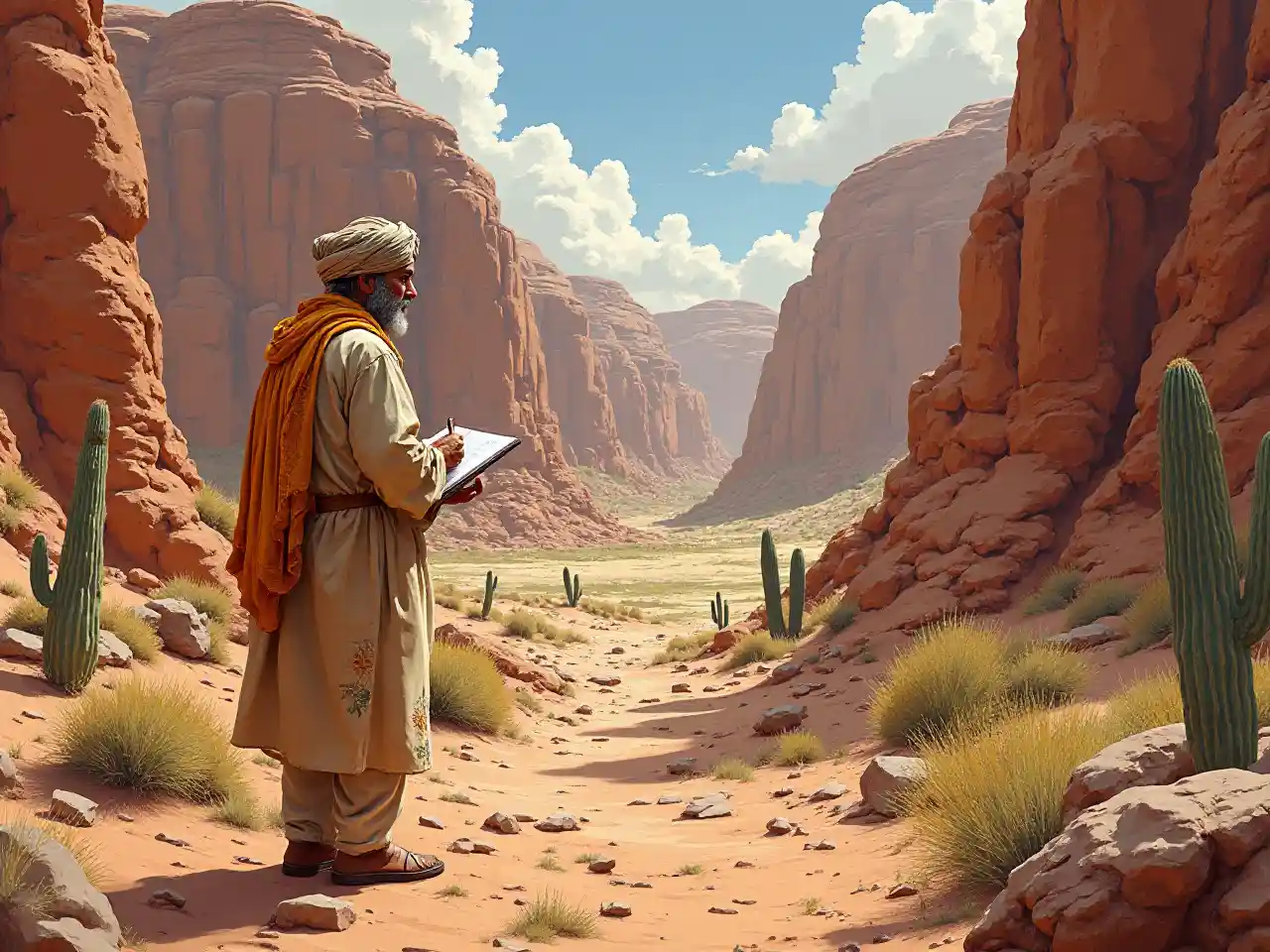 Scatto di rovine in un canyon del deserto, un uomo di 77 anni dell'Asia meridionale con un turban e indossa una kurta con ricamo del sole. Le scogliere rosse e i cactus lo inquadrano, le sue linee precise irradiano curiosità e meraviglia storica in una scena drammatica e arida. La sua arte cattura storie dimenticate.