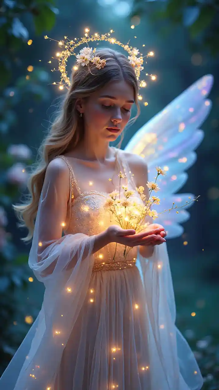 "Una rappresentazione luminosa ed eterica di una figura femminile serena, simile a un'entità divina o angelica. È vestita con un vestito fluido e radioso che brilla con luci multicolori, che ricorda una galassia o un'aurora boreale. Il suo mantello è semitrasparente, e emana un effetto iridescente e scintillante. Un'aureola con schemi intricati e raggianti circonda la sua testa, accentuando la sua presenza celeste. Sostiene fiori di loto brillanti nelle sue palme aperte, simboleggiando purezza e illuminazione. La sua espressione è calma e compassionevole, trasmettendo un senso di pace e di conforto. Il fondo è ricco di luci colorate e vibranti in stile bokeh, creando un'atmosfera mistica e altrimenti. Il testo 'Tu non sei solo' è posto dolcemente vicino al cuore della figura, brillantemente in armonia con le luci intorno".