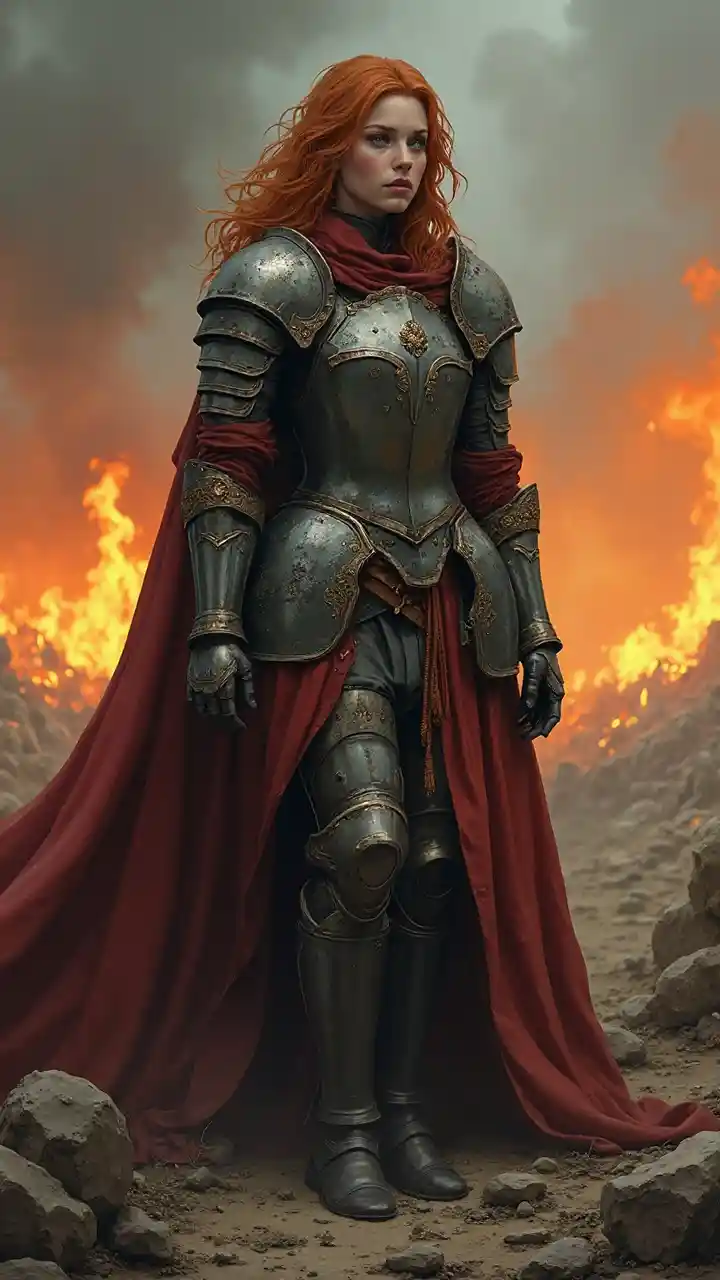 illustrazione dettagliata di una paladina divina di colore zenzero che indossa una corazza completa, una corazza pesantemente danneggiata, in piedi triste su un campo di battaglia, un campo di battaglia in fiamme come sfondo, miseria e decadenza, ambiente oscuro, arte di Mschiffer, colori tetratici,