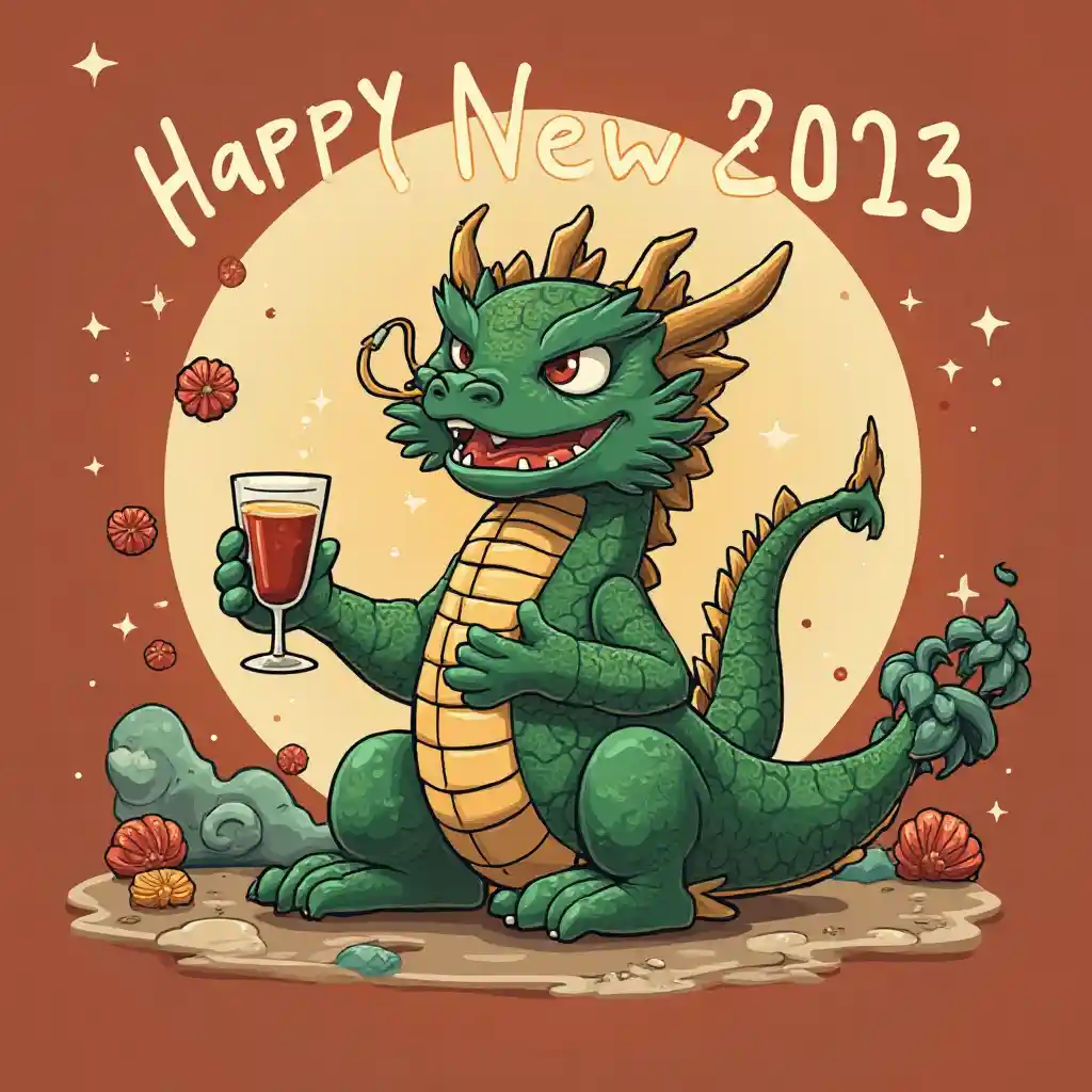 ColtonCreare un biglietto di auguri in stile "meme" Auguri per il nuovo anno 2025" su un biglietto con la foto di un drago di legno verde + mettere un bicchiere nelle mani e gli occupanti