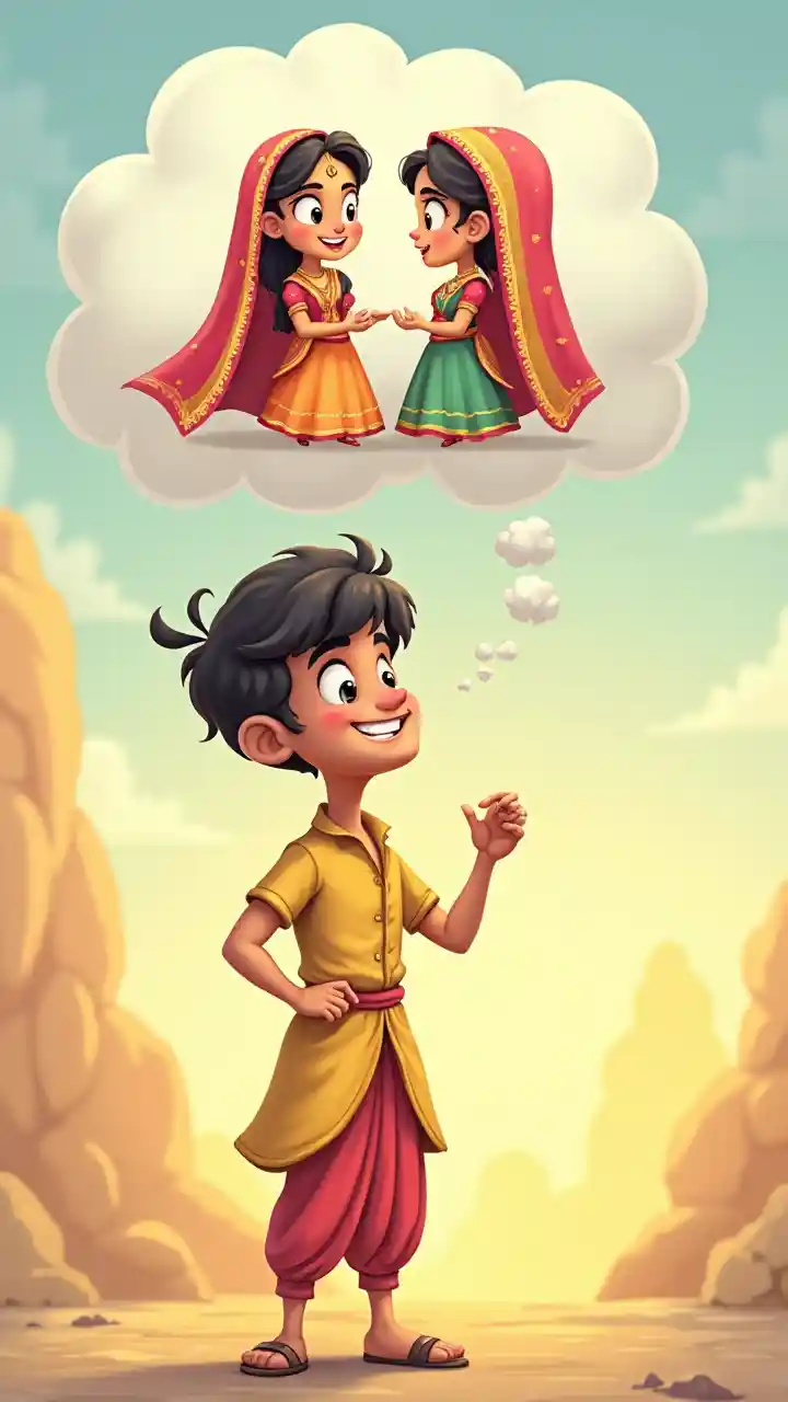 Un giovane indiano in stile cartone animato in 3D, in piedi sognando con un sorriso malizioso, immaginando di spos due donne. Una bolla di pensiero sognante mostra due spose in abiti da sposa tradizionali indiani. Colori vivaci, sfondo soleggiato, caratteri coerenti.