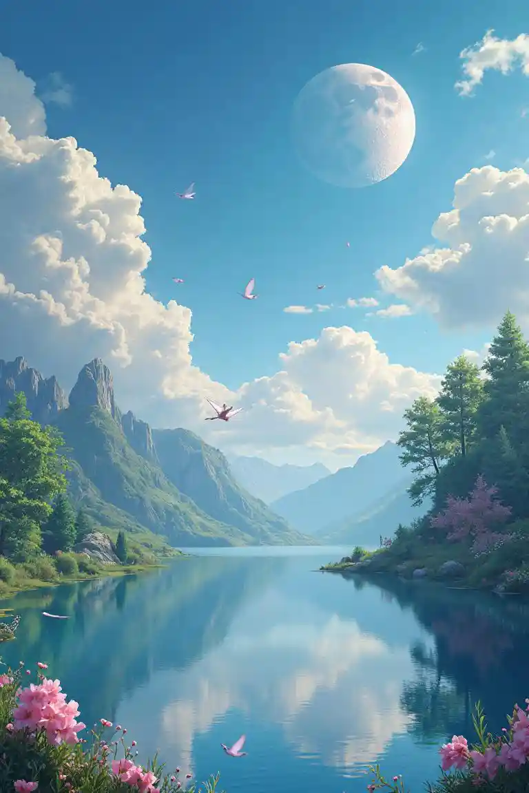 colori pastello, stile libro d'immagini, fate che volano nel cielo, luna, luna luminosa, lago, foresta, cristalli che fluttuano nell'aria, fantastico scenario, per i ren