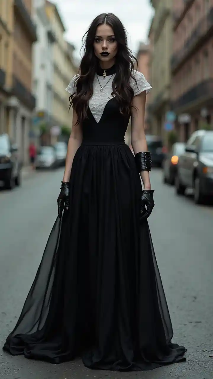 JocelynEmma Stone indossa un lungo vestito nero gotico e un rossetto nero e un eyeliner, foto del corpo, lo sfondo è nelle strade