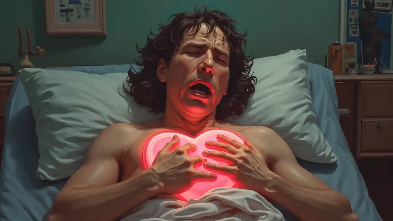 Una persona che ha un attacco di cuore, nello stile di Alex Gross, John Sloan, enfatizza l'emozione sul realismo, rollerwave, scene pittorie, Bart Sears, rendering realisti